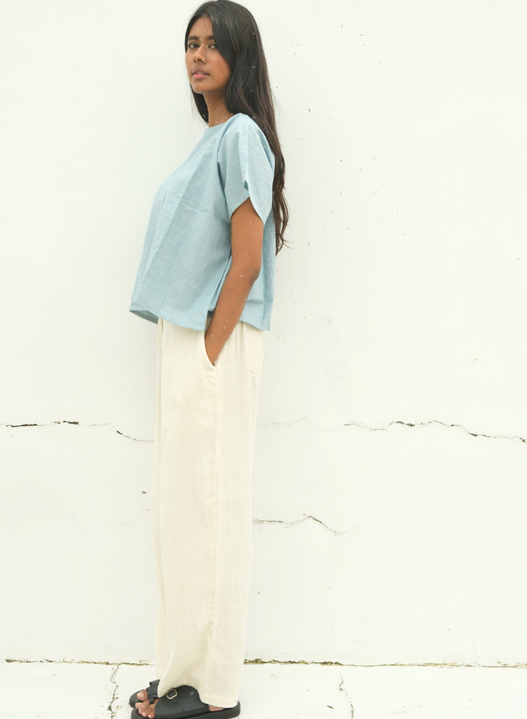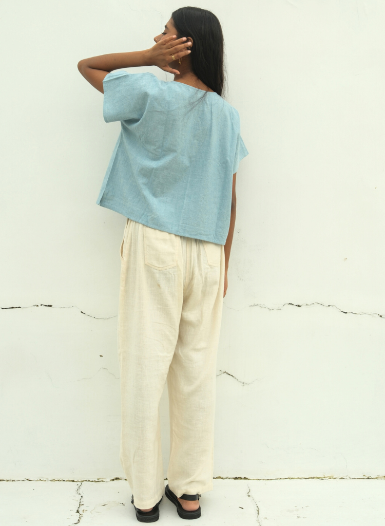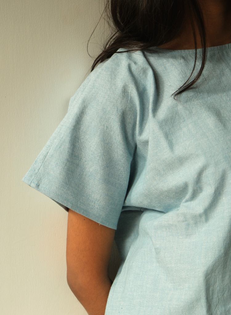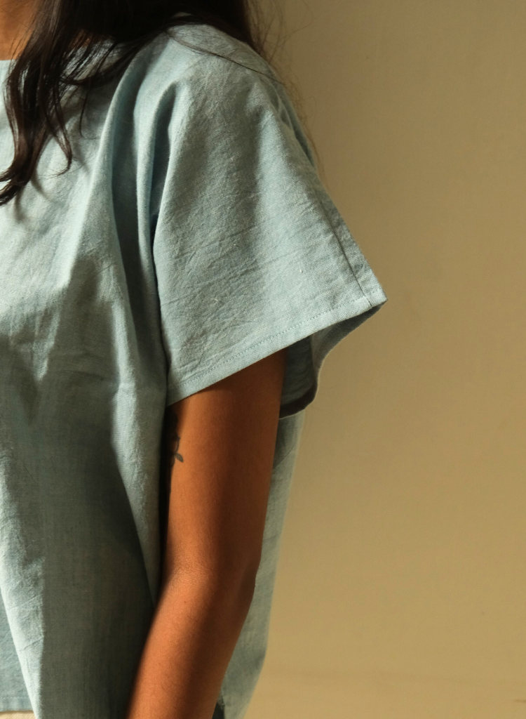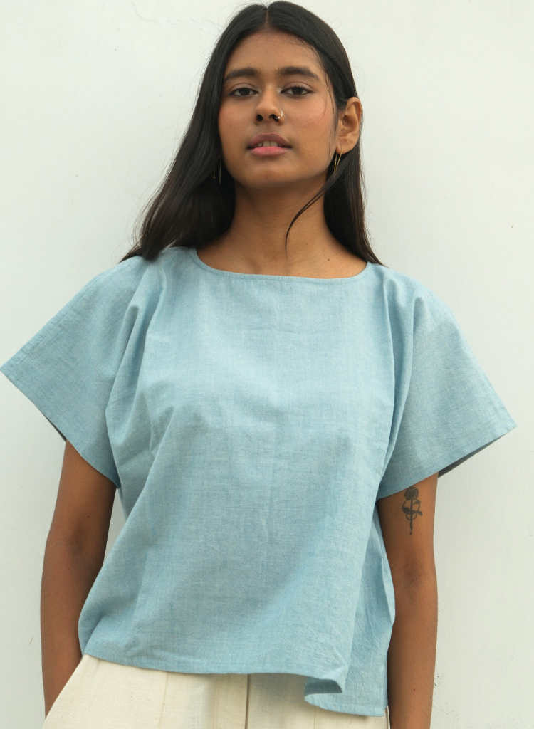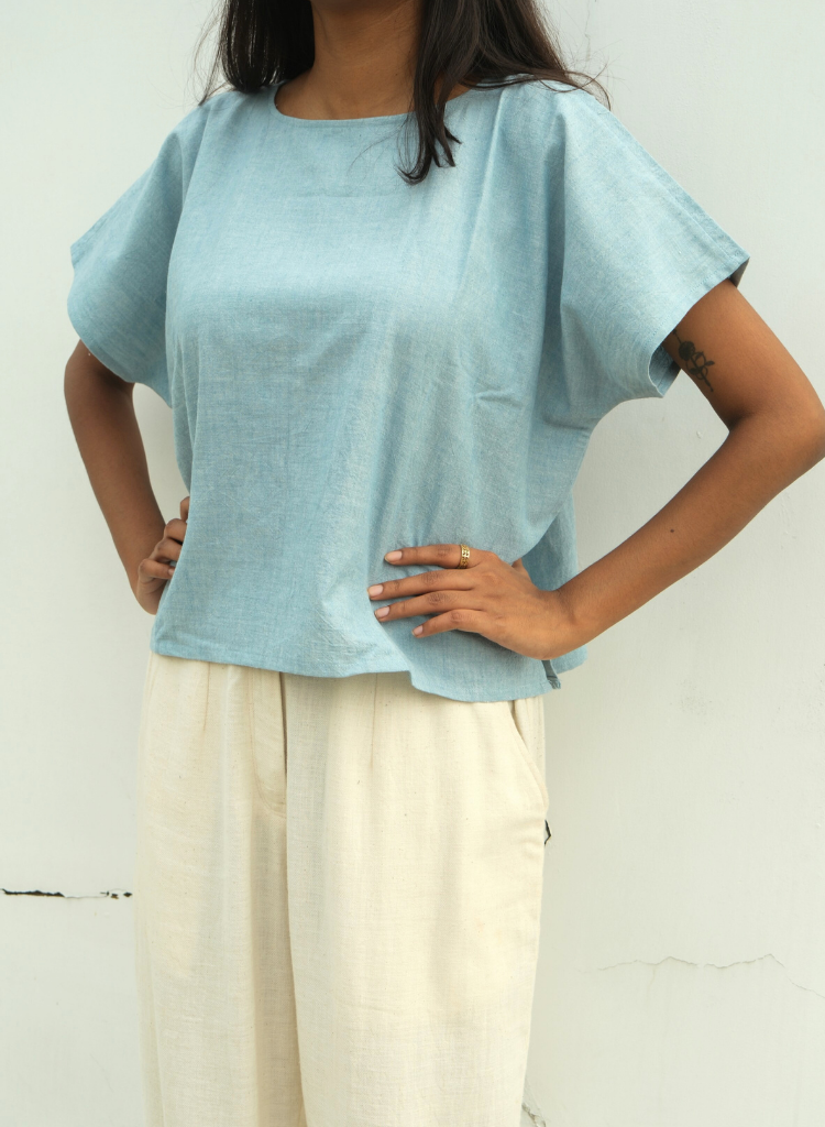 A box top featuring kimono sleeves with a wide neck. Length 21". The model is 5'5" and is wearing a size M.
