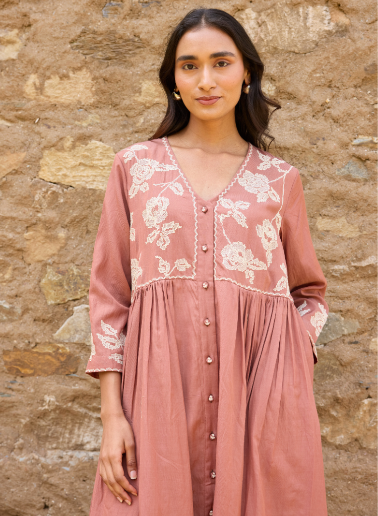 A three-piece set pairing the Karen Tunic, the Carly Pants and the Silk Organza Dupatta. The relaxed fitting tunic with floral embroidery and pleated sleeves features a V-neck, buttoned front and drop shoulders. Length 48". The straight-fit pants features a scalloped hem, a fitted front, elasticated back and inseam pockets. Length 38". Made in organic cotton. The model is 5'6" and is wearing a size S. The striped sheer Dupatta has scalloped edges. Length 5.5m. Made in silk organza.