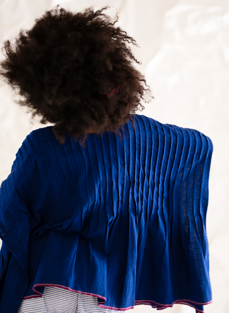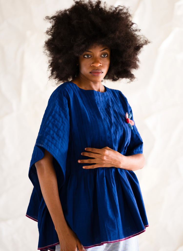 A top with soft pleats across the yoke featuring wide sleeves and subtle maroon selvedge at the hem. Length 26". The model is 5'5" and is wearing size S.