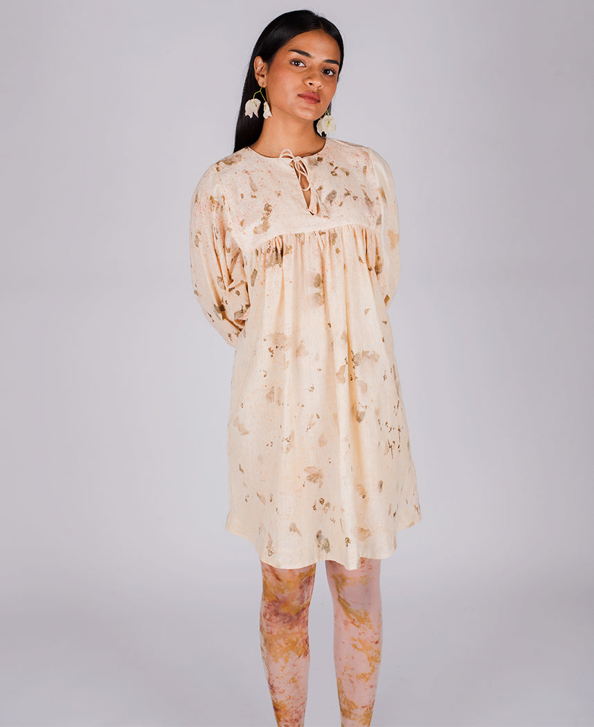 A relaxed eco printed mini dress with a gathered empire yoke. Features peasant sleeves and V-tie up neck. Length 34". The model is 5'3" and wearing size M.