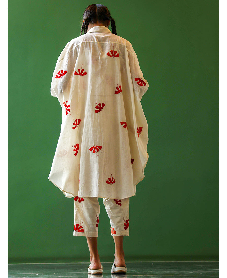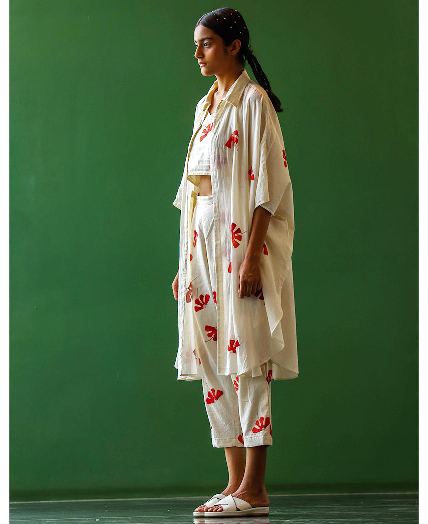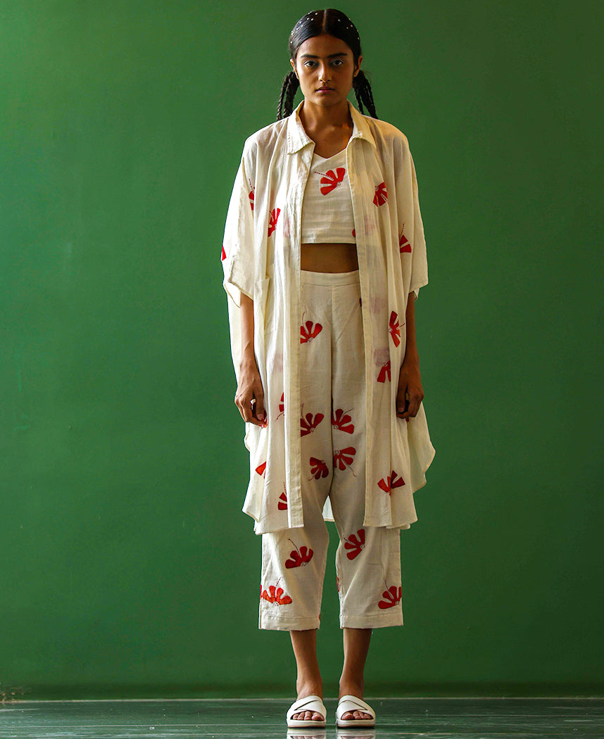 Cropped high waisted pants with flower appliqué details. Features side pockets and an elasticated back. Length 35". The model is wearing size M.