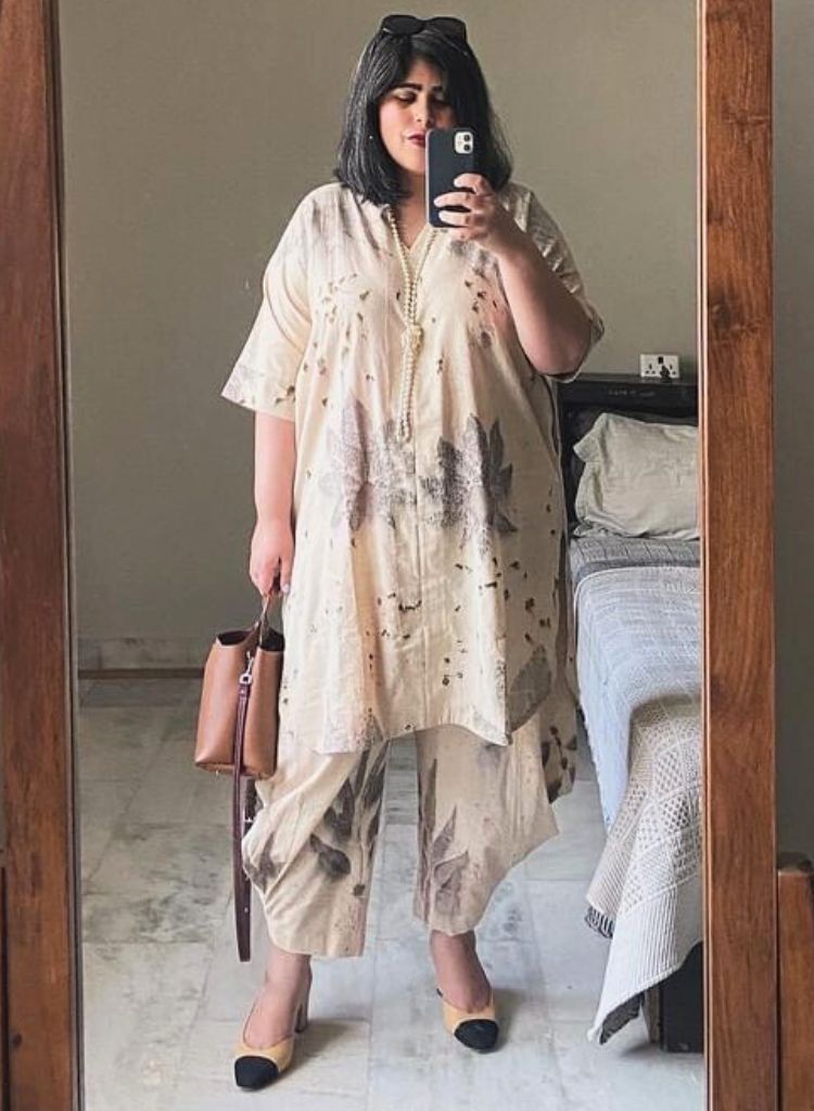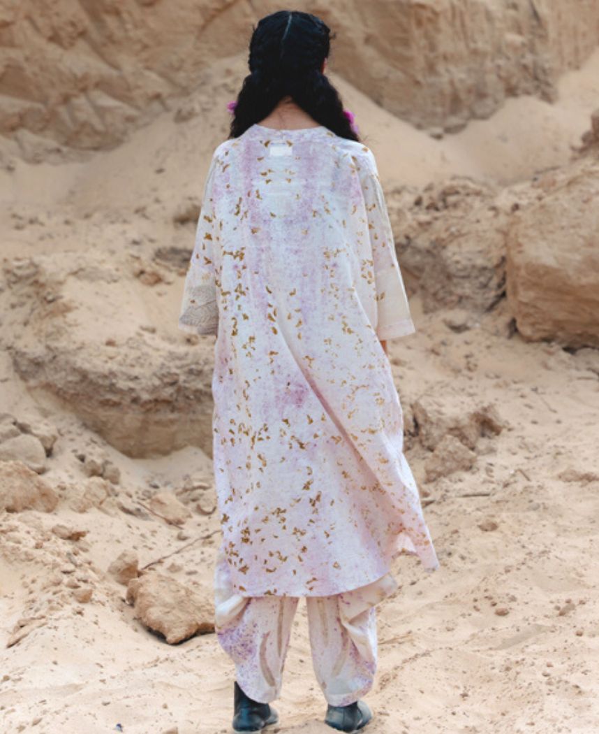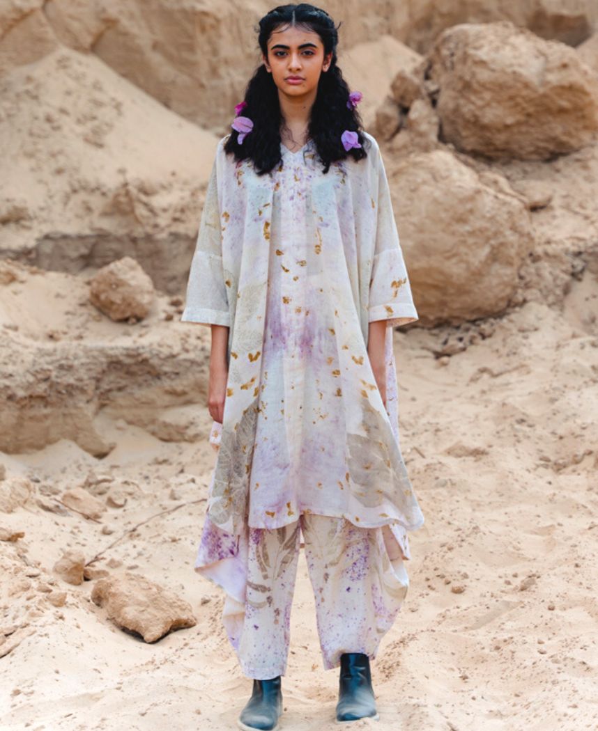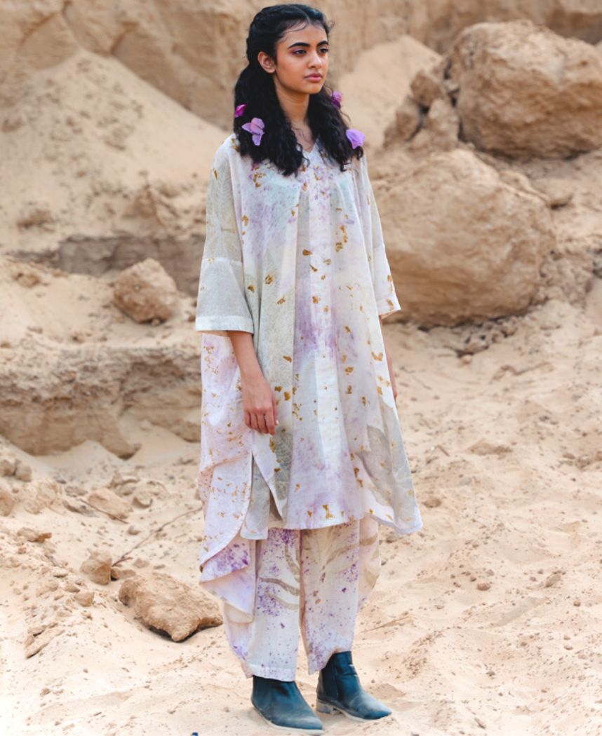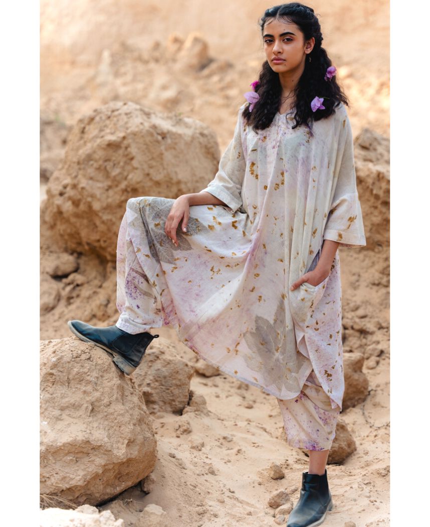 A two-piece set pairing the Lilac Blush Kurta and the Aaskshiya Rouge Pants. The relaxed eco-printed tunic with an asymmetric hem features a V-neck and a concealed front placket. Length 42". Comes in a free size that fits sizes XS to 3X. The cropped eco-printed pants with a relaxed fit feature inseam pockets and an elasticated back. Length 36". The model is 5'6" and is wearing free-size top and XS pants.