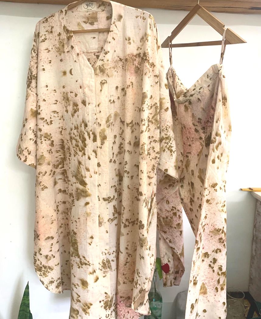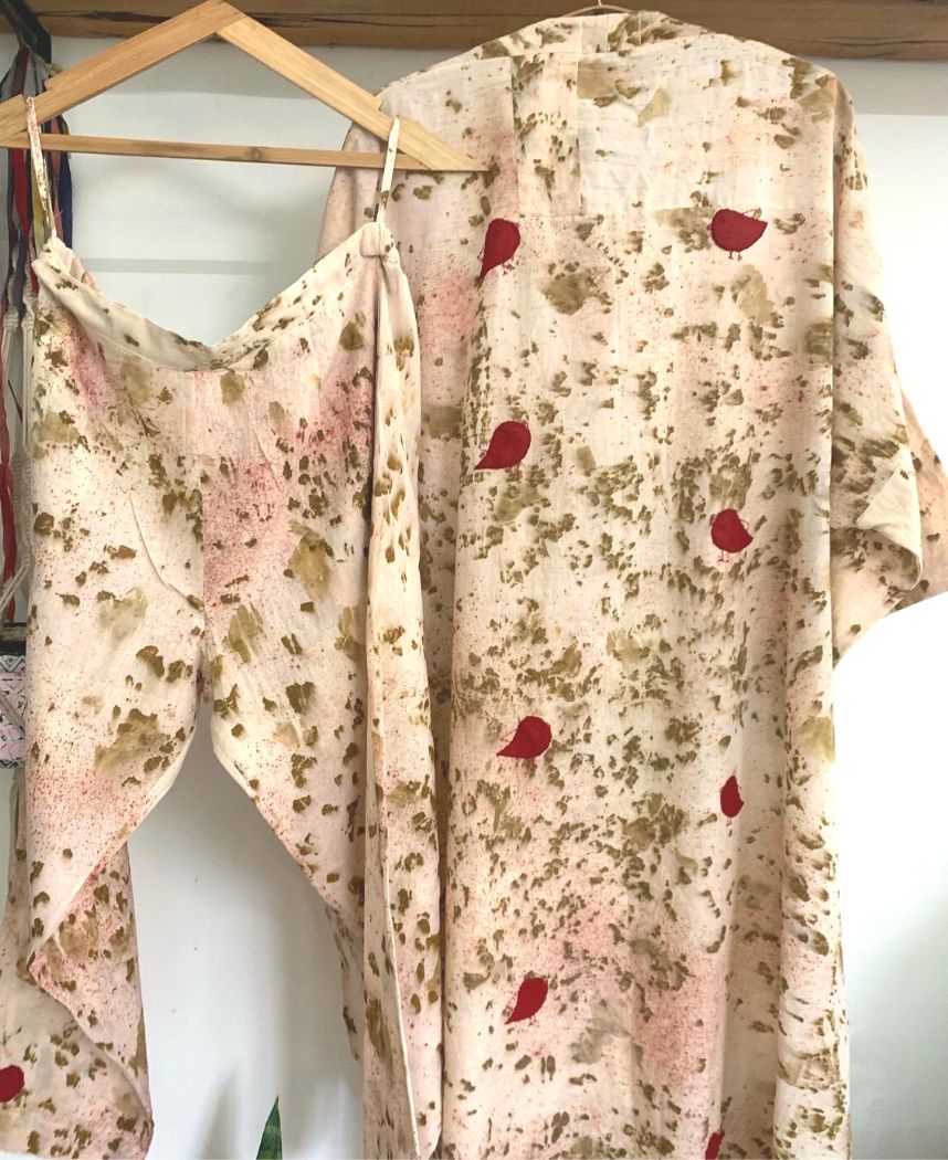 Made in 100% organic handspun cotton, eco printed with roots, flowers and leaves.