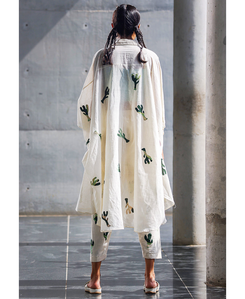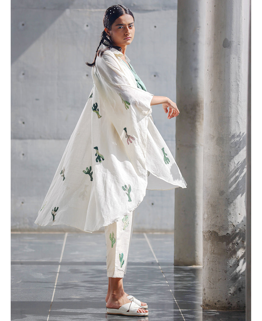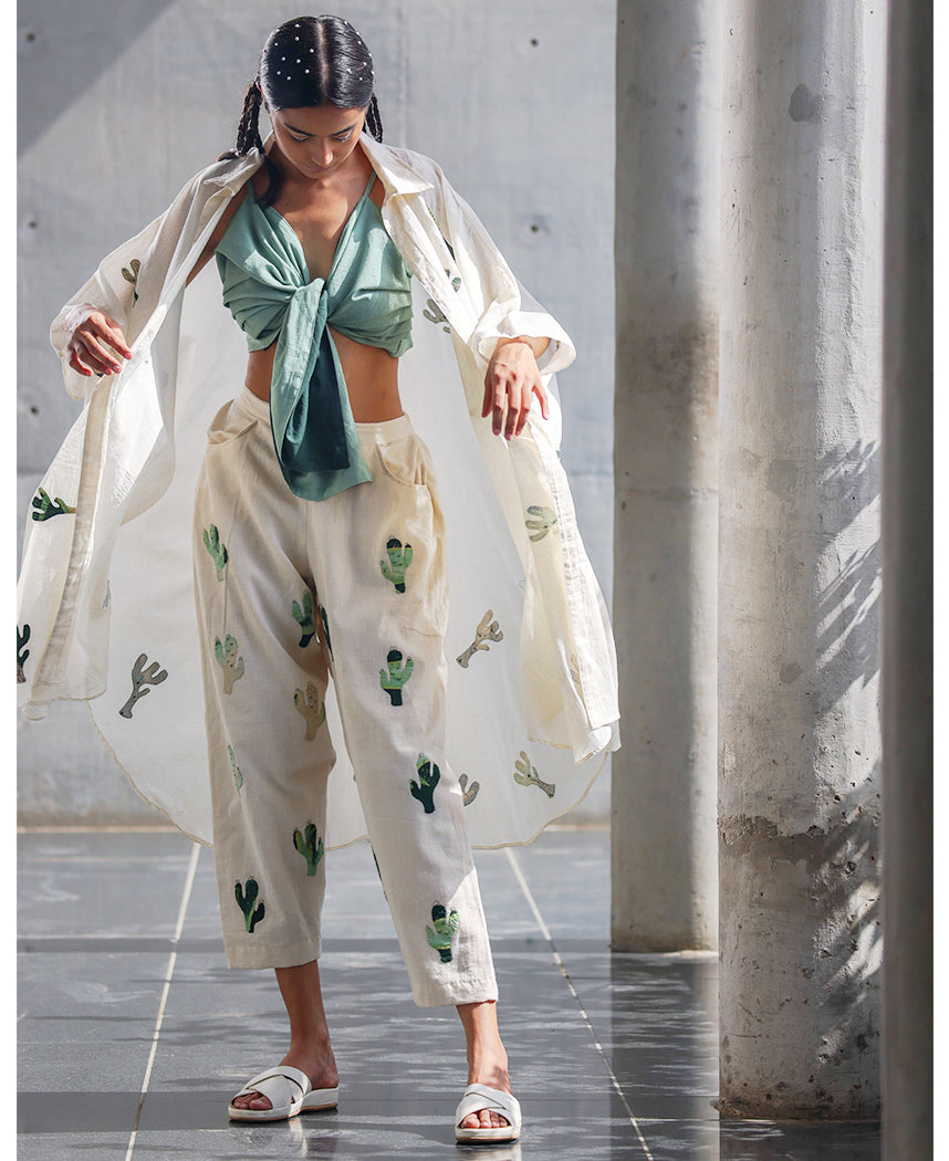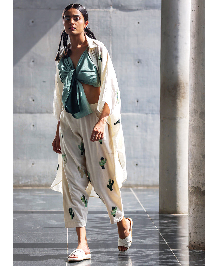 A three-piece set pairing the Prickly Overlay, Tie Top and Pants. The free size overlay features cactus appliqué details, a shirt collar, a patch pocket and side slits. Front length 40.5", Back length 42". The overlay fits sizes XS-3X. The solid crop top features a tie-up front, noodle straps and side gathers. Length 11.5". The cropped pants feature cactus appliqué details, side pockets and an elasticated back. Length 35". The model is wearing size M. The top and pants are lined.