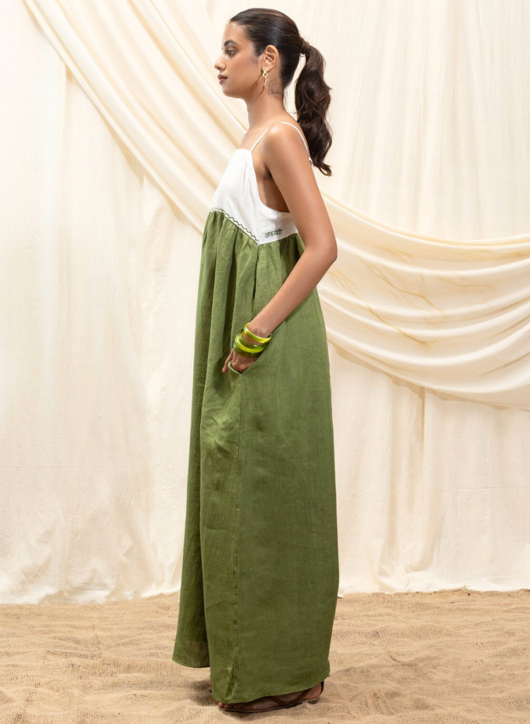 A relaxed fitting colour blocked dress featuring a square neck, adjustable straps and a low back. Length 43". The model is 5'7" and is wearing size M.