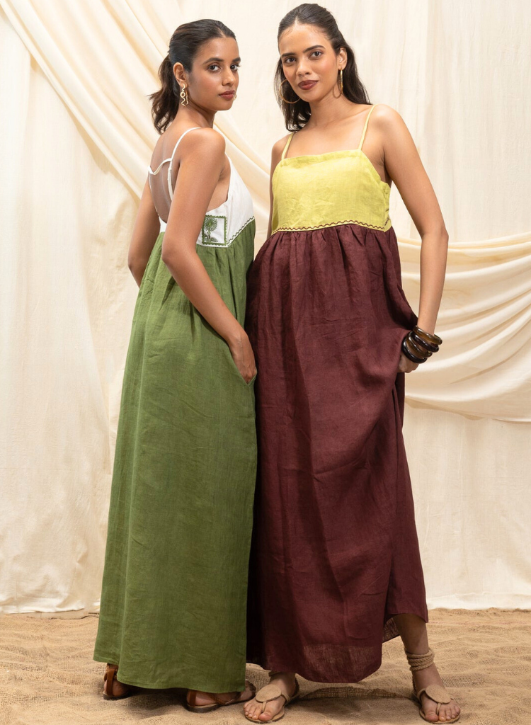 A relaxed fitting colour blocked dress featuring a square neck, adjustable straps and a low back. Length 43". The model is 5'7" and is wearing size M.