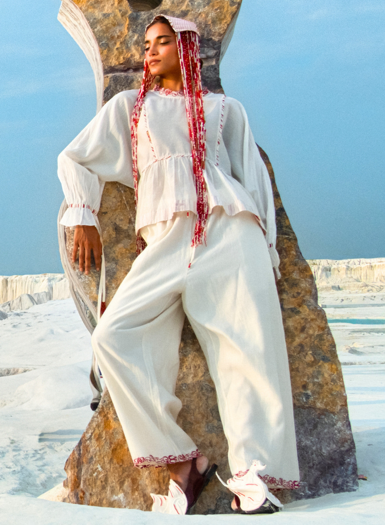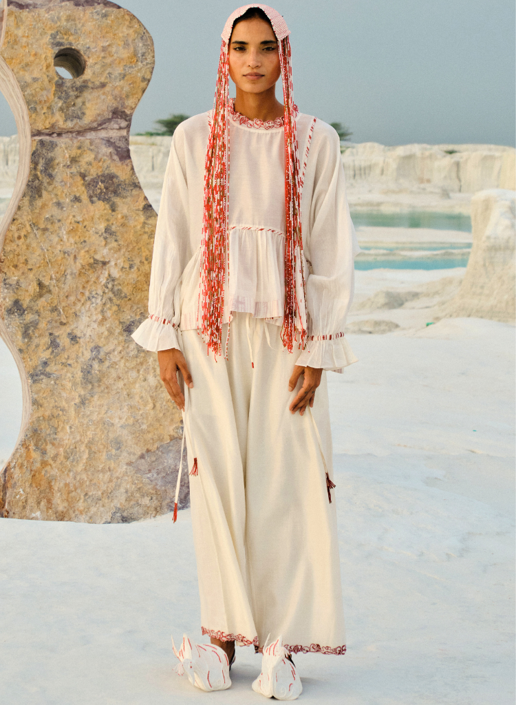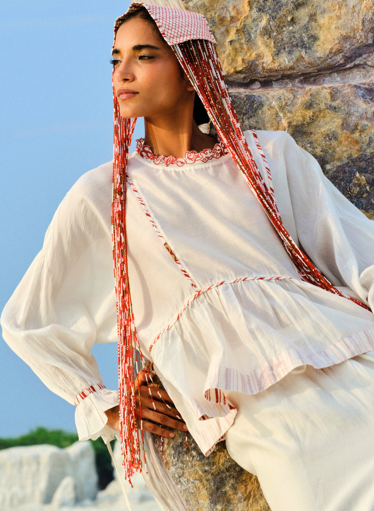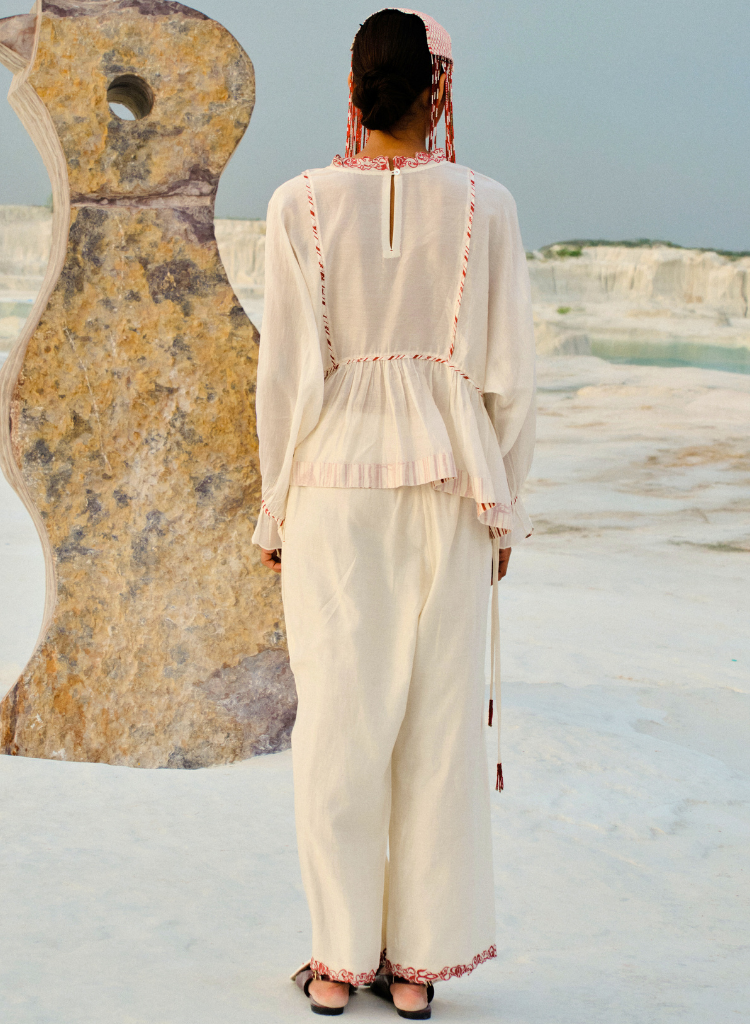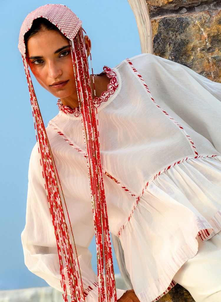 A relaxed fit top with gathers on waist and cuff featuring a hand-embroidered neckline and paneled yoke. Length 22". The model is 5'8" and is wearing a size M.