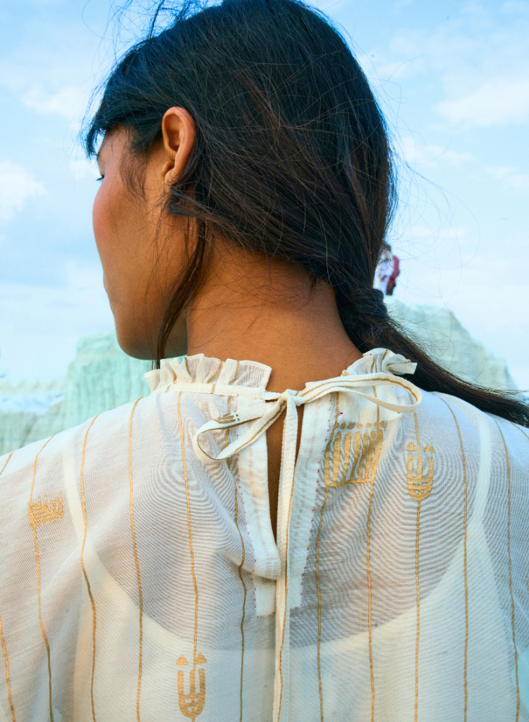A shift dress featuring a gathered neckline and back tie-up with handmade beaded tassels. Length 31.5". The model is 5'8" and is wearing a size M.