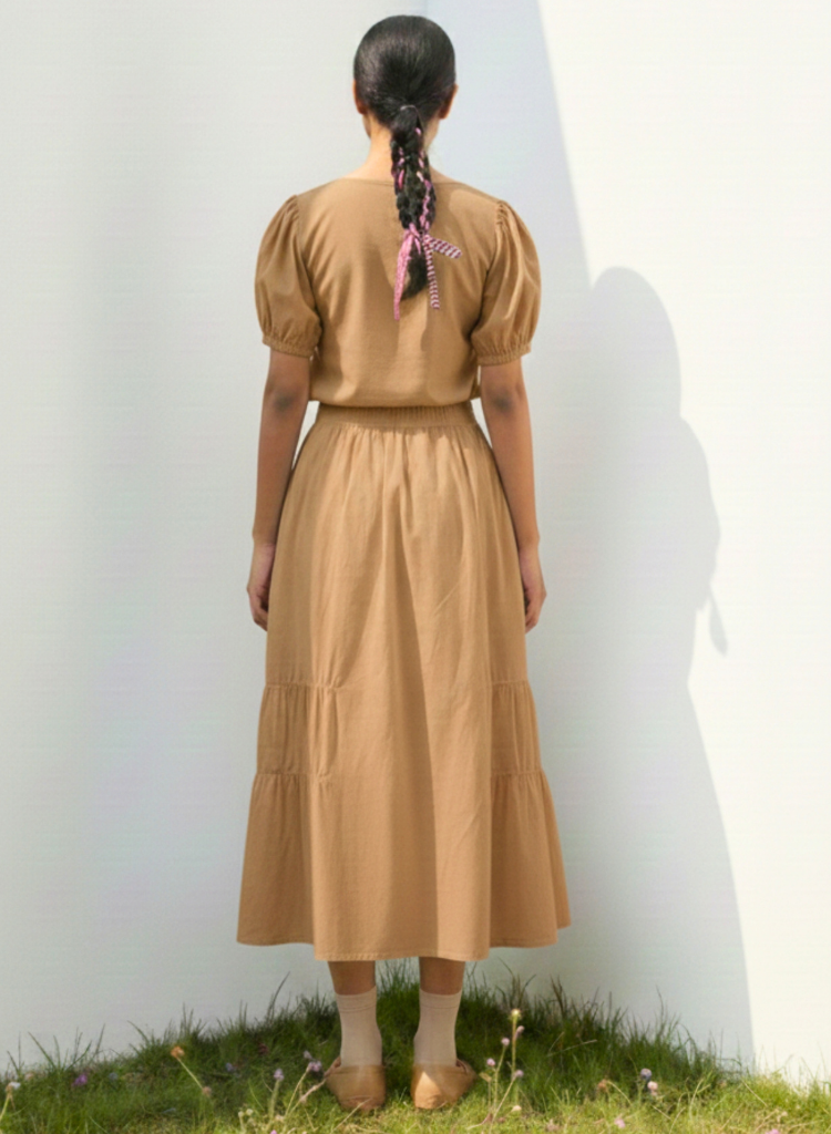 A two-piece set pairing the Fern Top and the Lizzy Skirt. The short top with patch embroidery features a V-neck, patch pockets and frill details. Length 21". The deconstructed midi skirt with gathers features a back elastic and inseam pockets. Length 32". The model is 5'6" and is wearing size S.