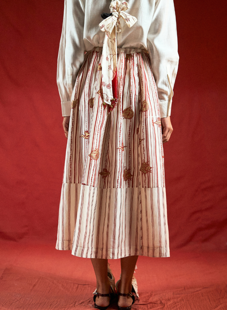 A playful half-and-half midi skirt featuring a drawstring waistband that ties at both ends for a perfect fit. Soft gathers create gentle movement, while handmade beaded tassels lend delicate detail. Length 34". The model is 5'8" and is wearing a size M.