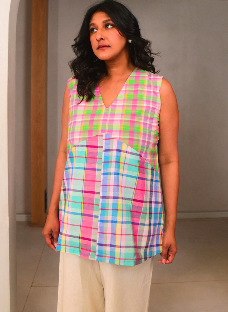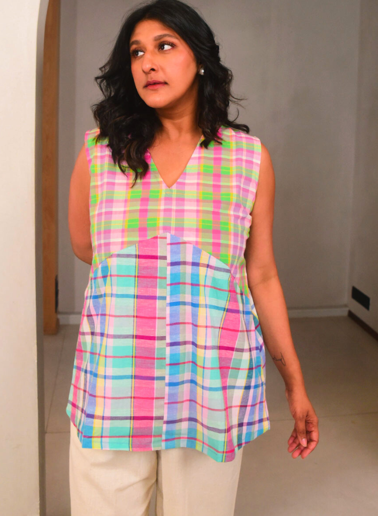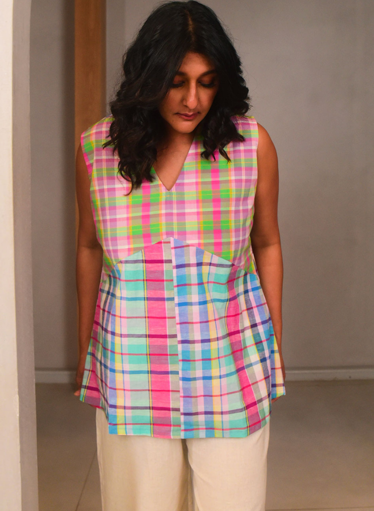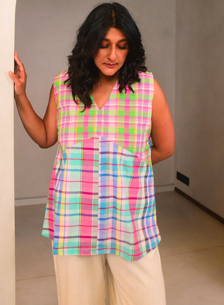An easygoing summer staple, this sleeveless top features a playful mix of exclusive pink and blue checkered cottons. Designed with subtle paneling for shape and ease, its relaxed silhouette makes it endlessly versatile. Length 28". The model is 5'6" and is wearing size L.