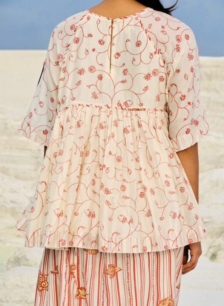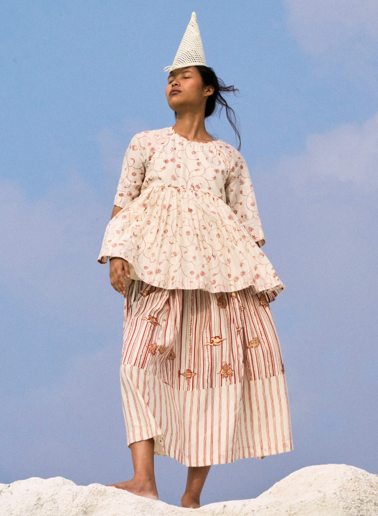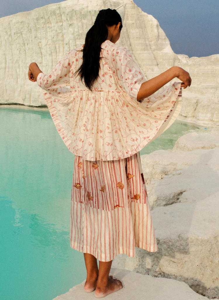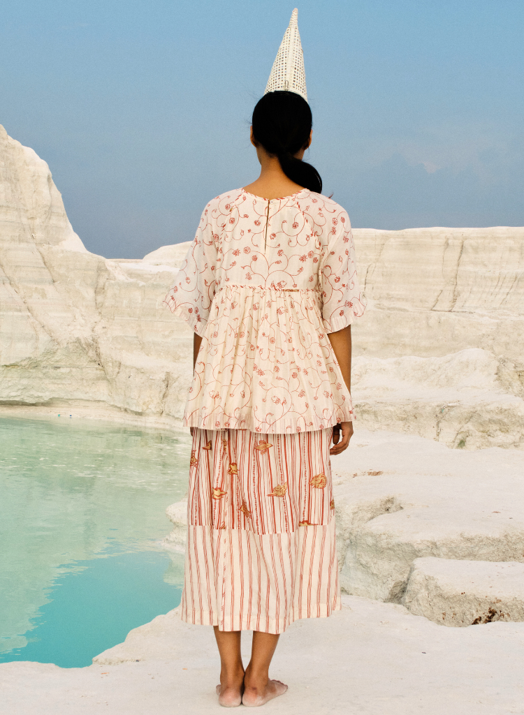 A two-piece set pairing the Taya Raglan Top and the Htami Drawstring Panelled Skirt. The top with soft gathers features raglan sleeves and a subtle back opening. Length 28". The playful half-and-half midi skirt features a drawstring waistband that ties at both ends for a perfect fit. Soft gathers create gentle movement, while handmade beaded tassels lend delicate detail. Length 34". The model is 5'8" and is wearing a size M.