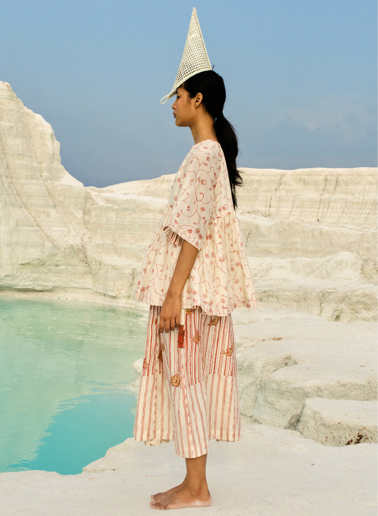 A top with soft gathers featuring raglan sleeves and a subtle back opening. Length 28". The model is 5'8" and is wearing a size M.
