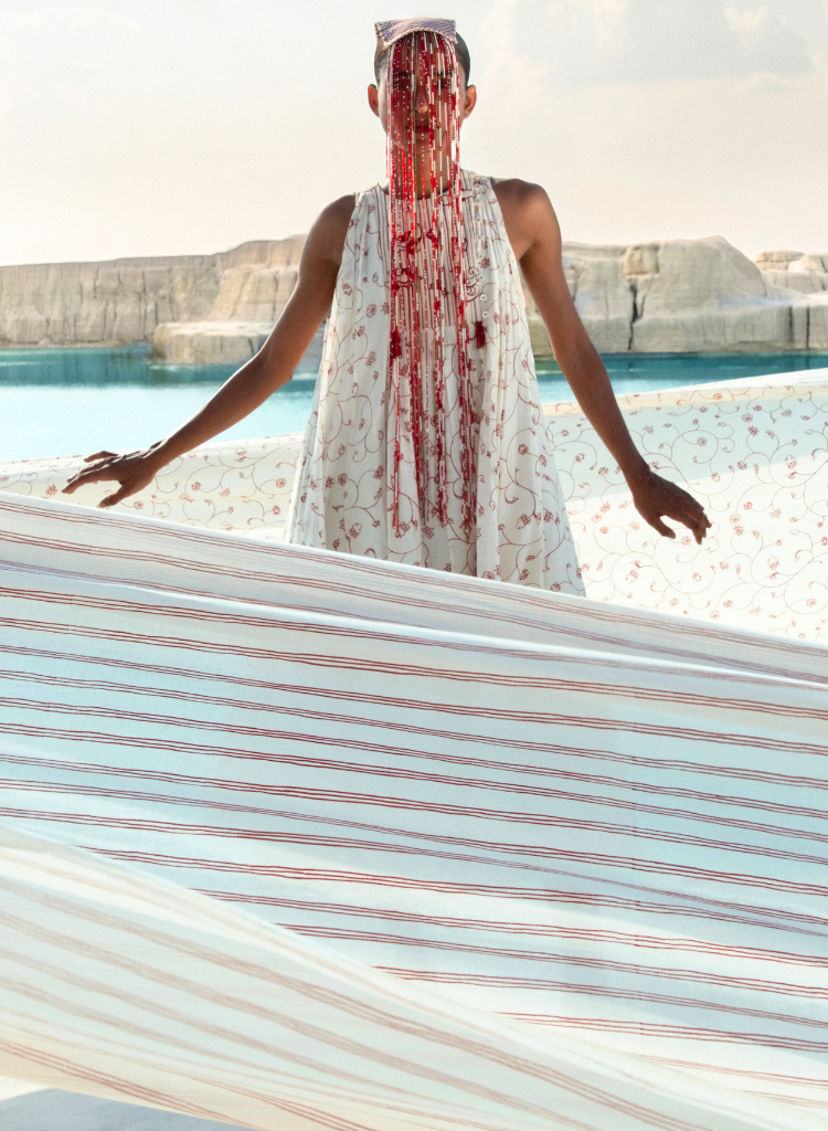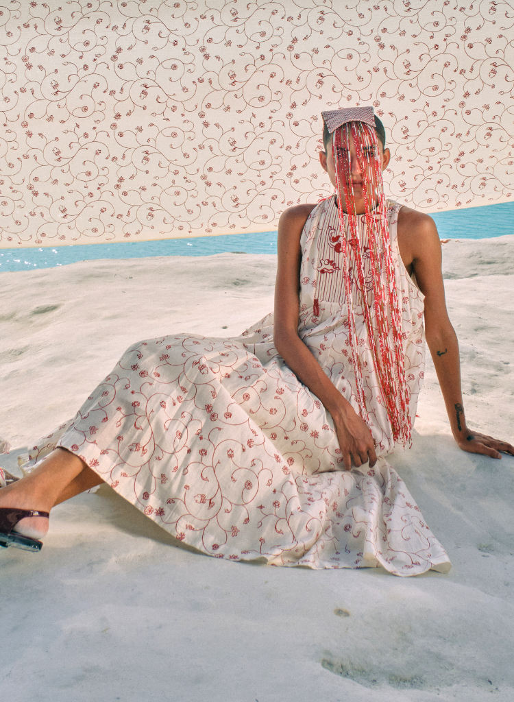 A midi dress with subtle hand-beaded accents featuring quilted yoke and front placket with mop buttons. Length 44.5". The model is 5'8" and is wearing a size M.