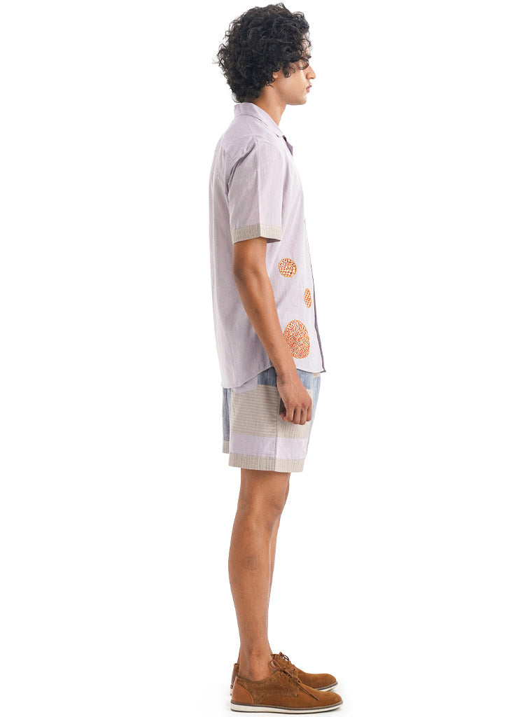 Detailed with playful bubble motifs, hand-embroidered Kantha work and appliqué , this shirt features a camp collar. Length 29". The model is 6'1" and is wearing a size S.