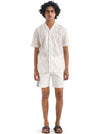 A short sleeve shirt with Kantha work highlights featuring a camp collar. Length 29". The model is 6'1" and is wearing a size S.