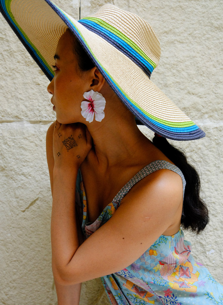 A statement wide-leg jumpsuit with a sleeveless, strappy silhouette featuring a flattering V-neckline. Wide flared legs and a cross-back strap detail add a bold twist. Adorned with a Kantha-inspired floral print that spans across the body, this jumpsuit is a celebration of vibrant colours and intricate patterns. The model is 5'7" and is wearing size XS.