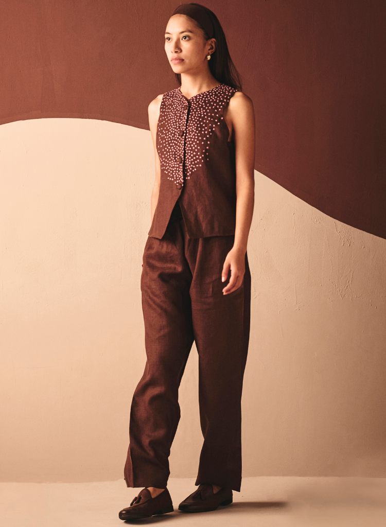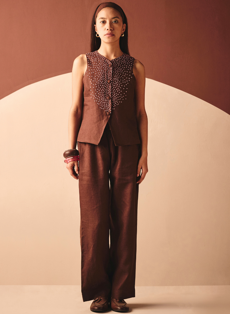 A two-piece set pairing the Azul Cross Vest and the Eri Elasticated Pants. The sleeveless vest features a button down and embroidery on front. Length 24". The pants features an elasticated waist and front pockets. Length 40". The model is 5'9” and is wearing size S.