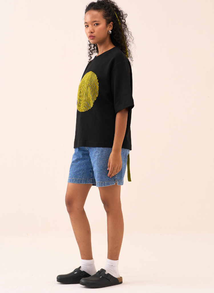 A relaxed fitting straight hem Tshirt with circle embroidery detail featuring a round neck. Length 25". The model is 5'7" and is wearing size S.