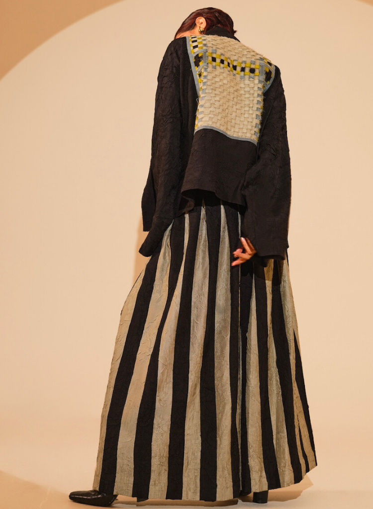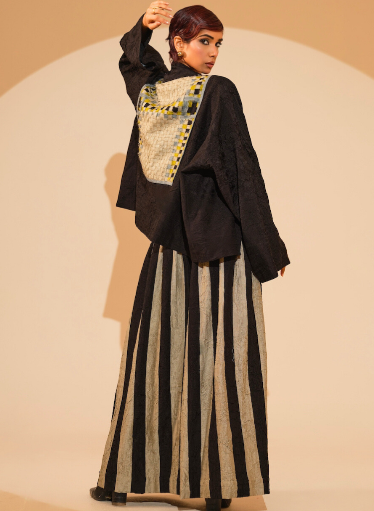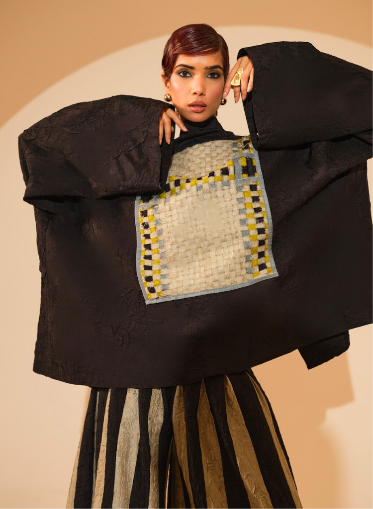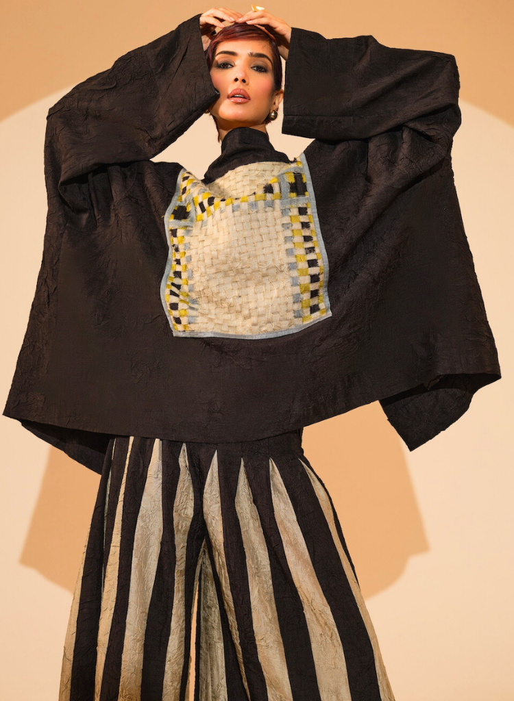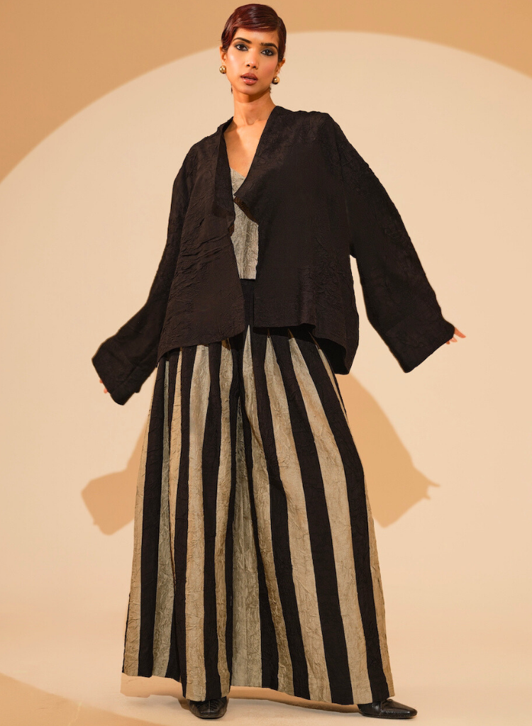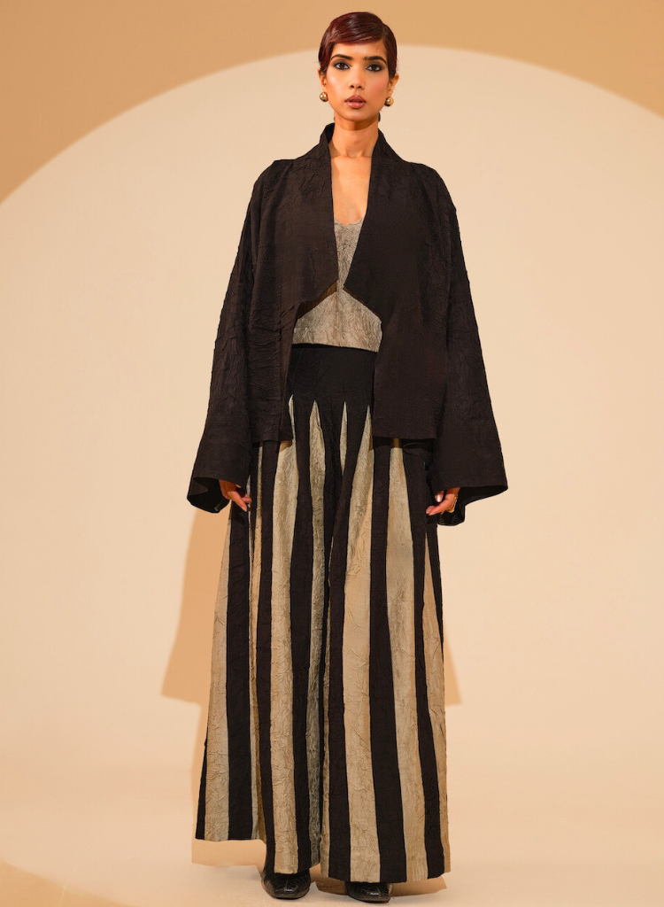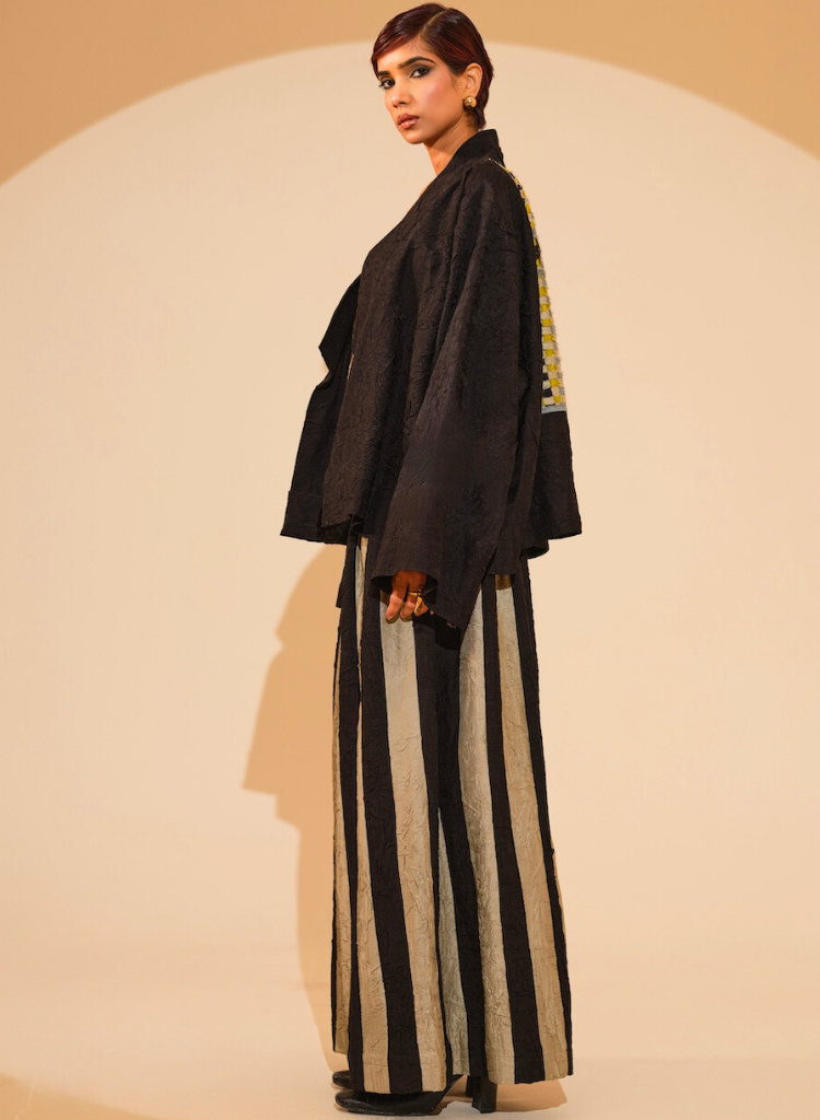 A two-piece set pairing the Bloom Overlay and the Twin Pants. The oversized jacket features an intricately hand-woven patch at the back — a subtle statement of detail and texture. Length 28". The flared trousers feature delicate hand-sewn pleats, finished with a full belt and zip closure for a seamless fit. Length 38". The model is 5'8" and is wearing S.