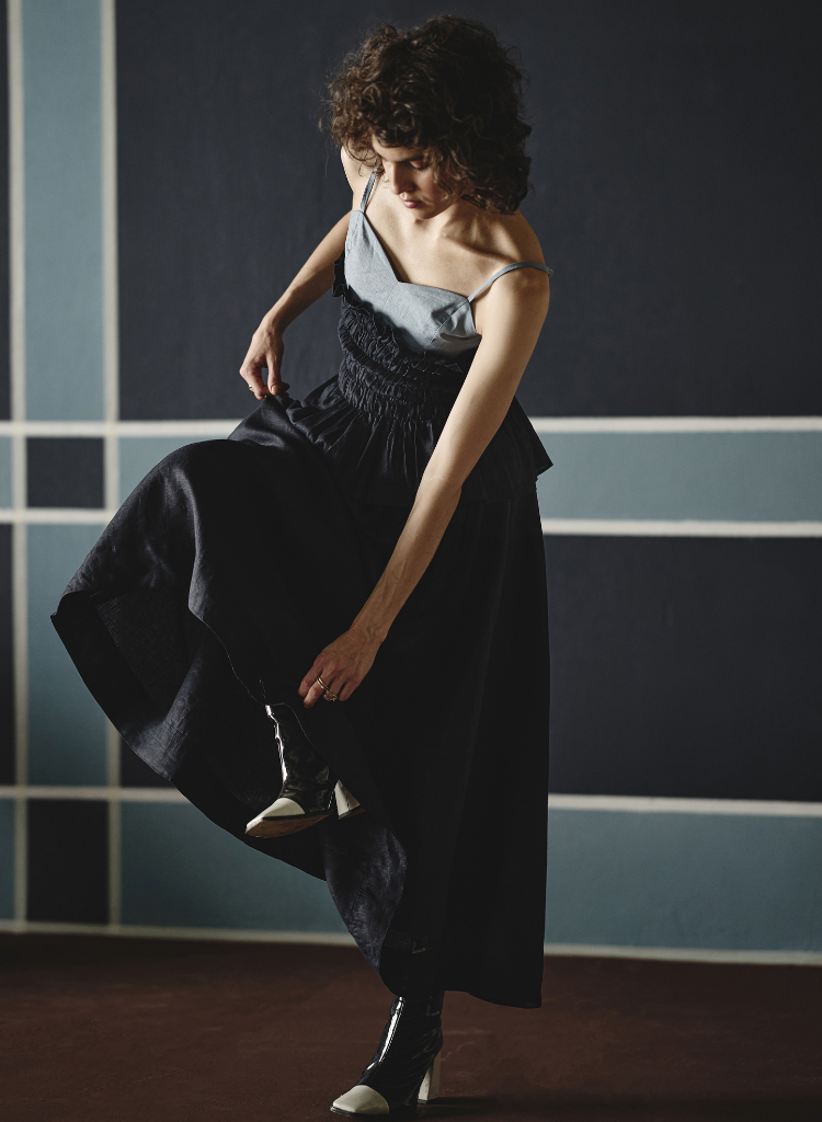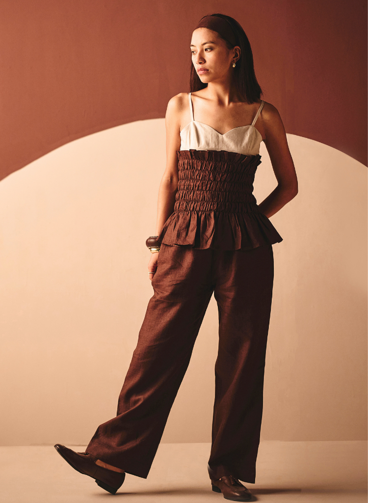 A sleeveless top featuring a contrast bodice and front smocked silhouette. Length 26". The model is 5'9” and is wearing size S.