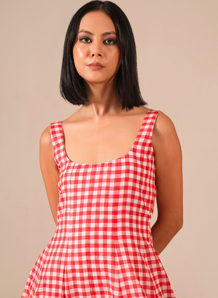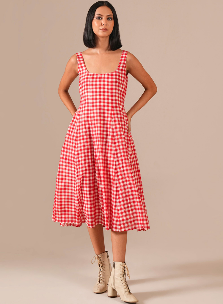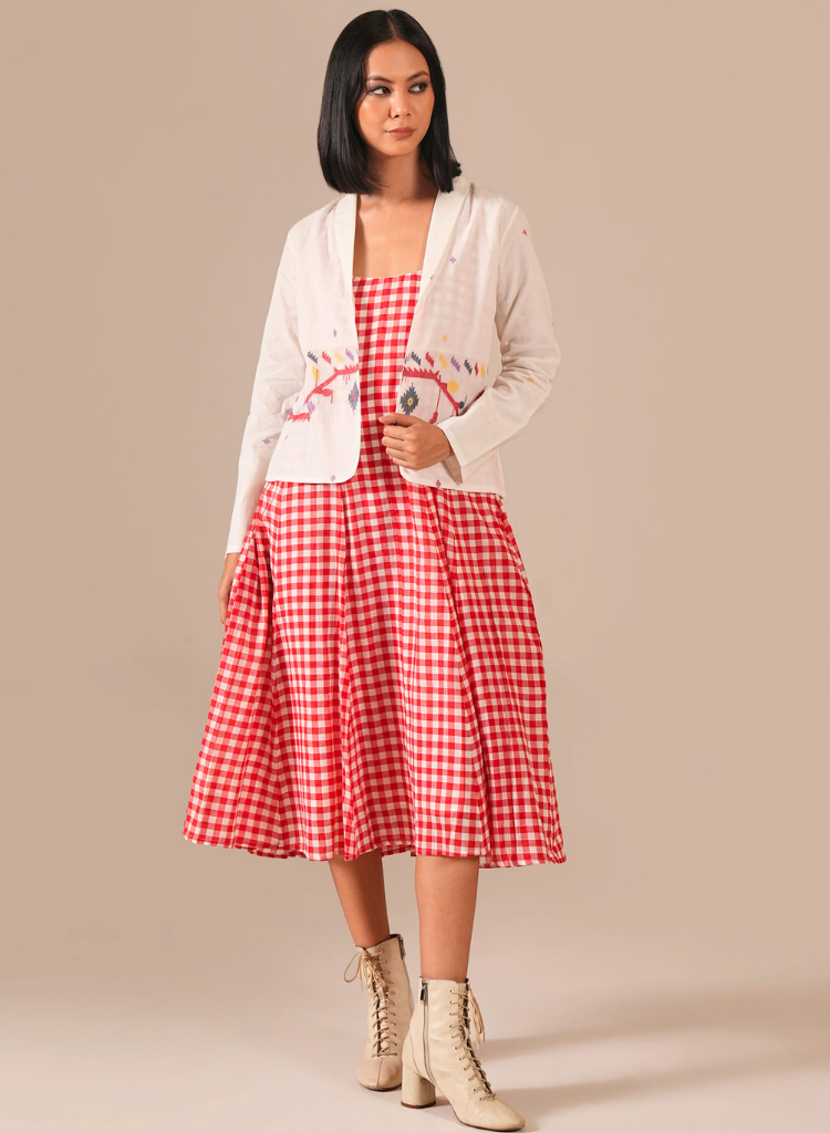 A two-piece set pairing a dress and a jacket. The dress with panel detailing features a deep square neck dress and back zipper fastening. Length 45". Fully lined. The jacket features a lapel collar and long sleeves. Length 22". The model is 5'6" and is wearing a size S.