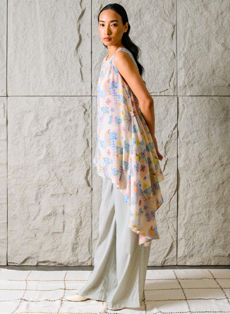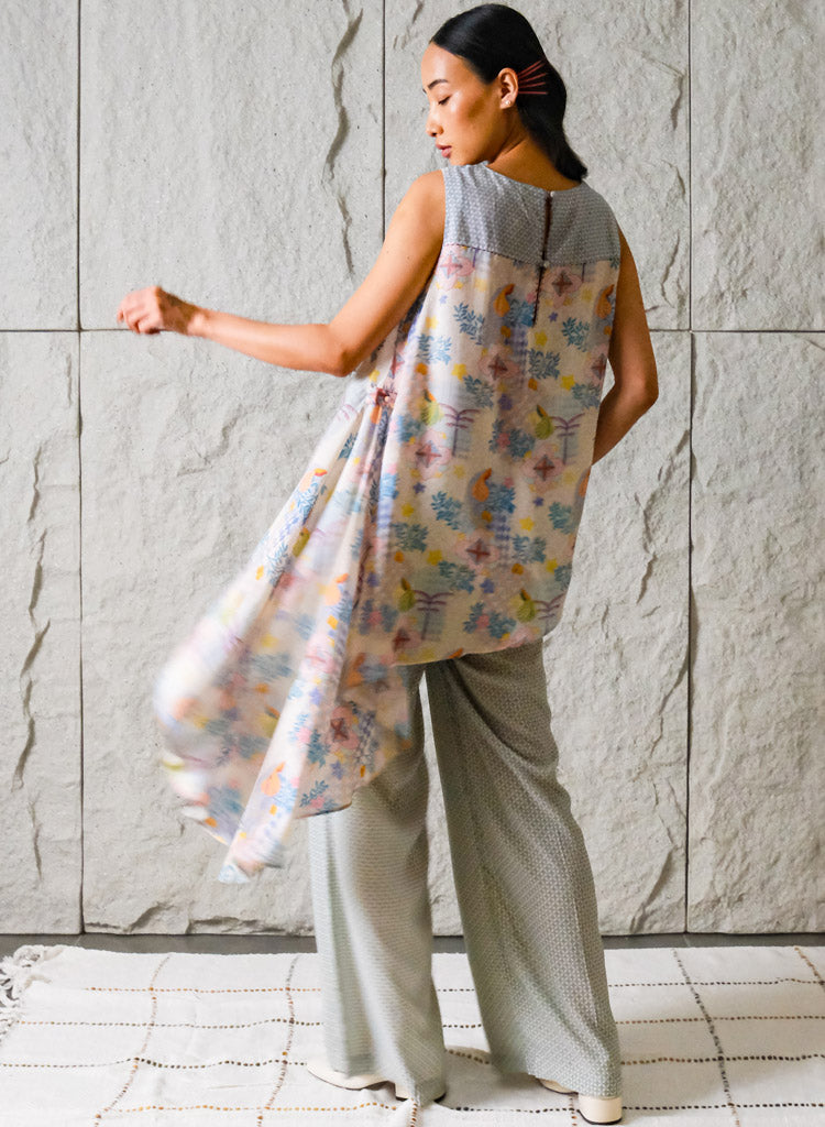 A sleeveless top boasting a unique handkerchief hemline that cascades down with fluidity featuring a round neck. The model is 5'7" and is wearing size XS.