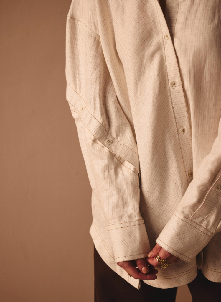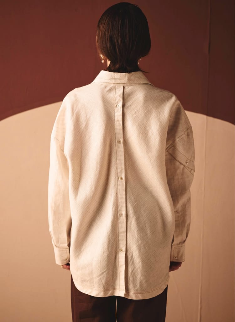 A relaxed fit shirt featuring contrast stitch details. Length 29". The model is 5'9” and is wearing size S.