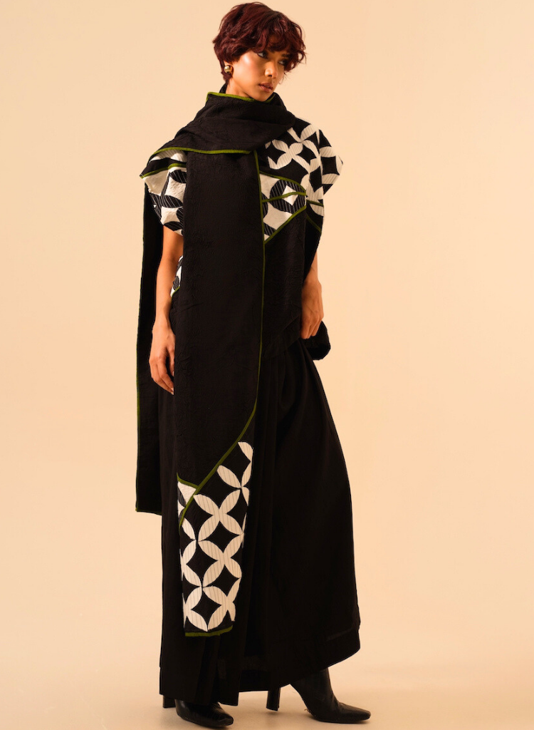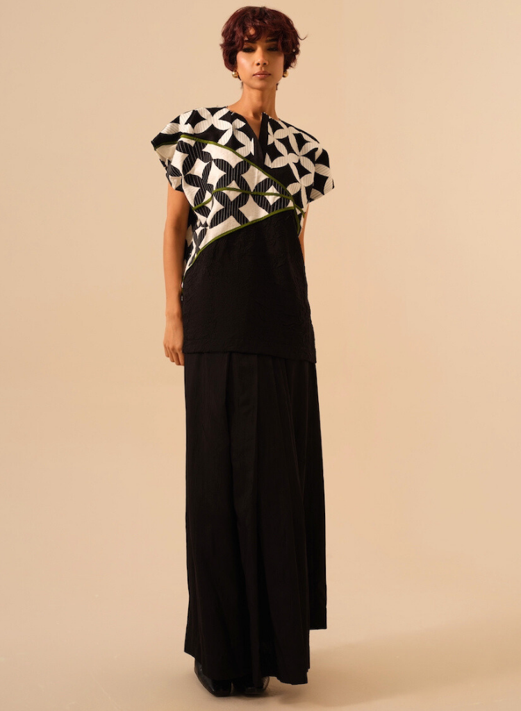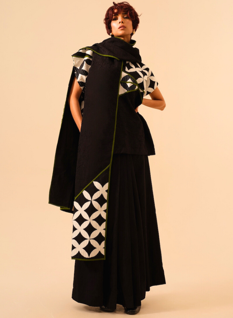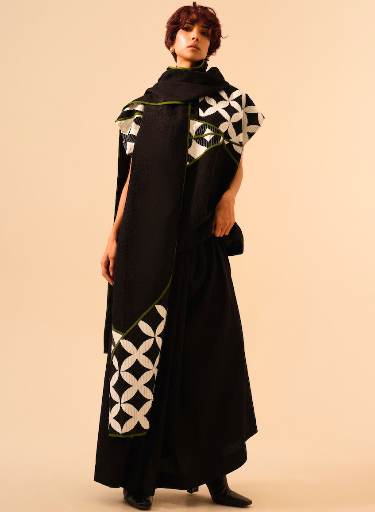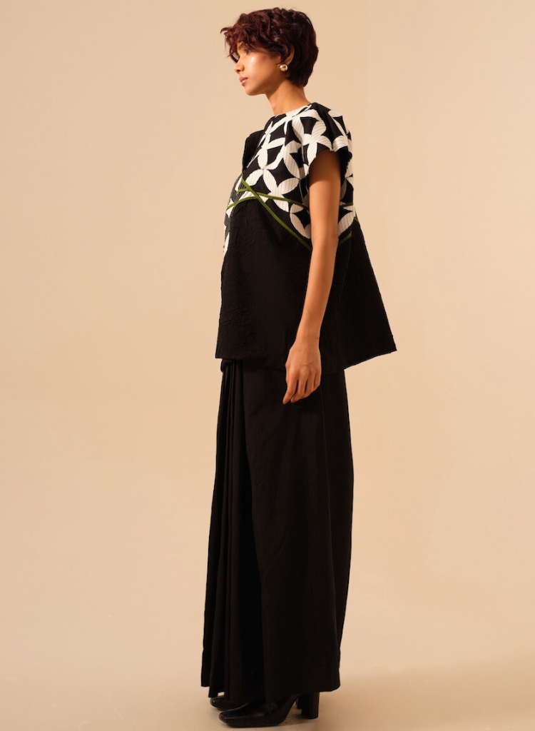 A three-piece set pairing the Mist Top and the Mist Skirt and the Mist Scarf. The structured one-size top features hand-stitched red floral motifs. Length 25". The sari-inspired pleated skirt features sharp, sculptural pleats. Length 42". Made in Mysore silk. The delicate scarf in crushed silk is detailed with hand-stitched floral motifs and edged with a striking contrast.