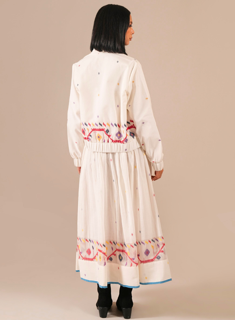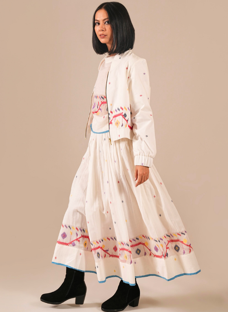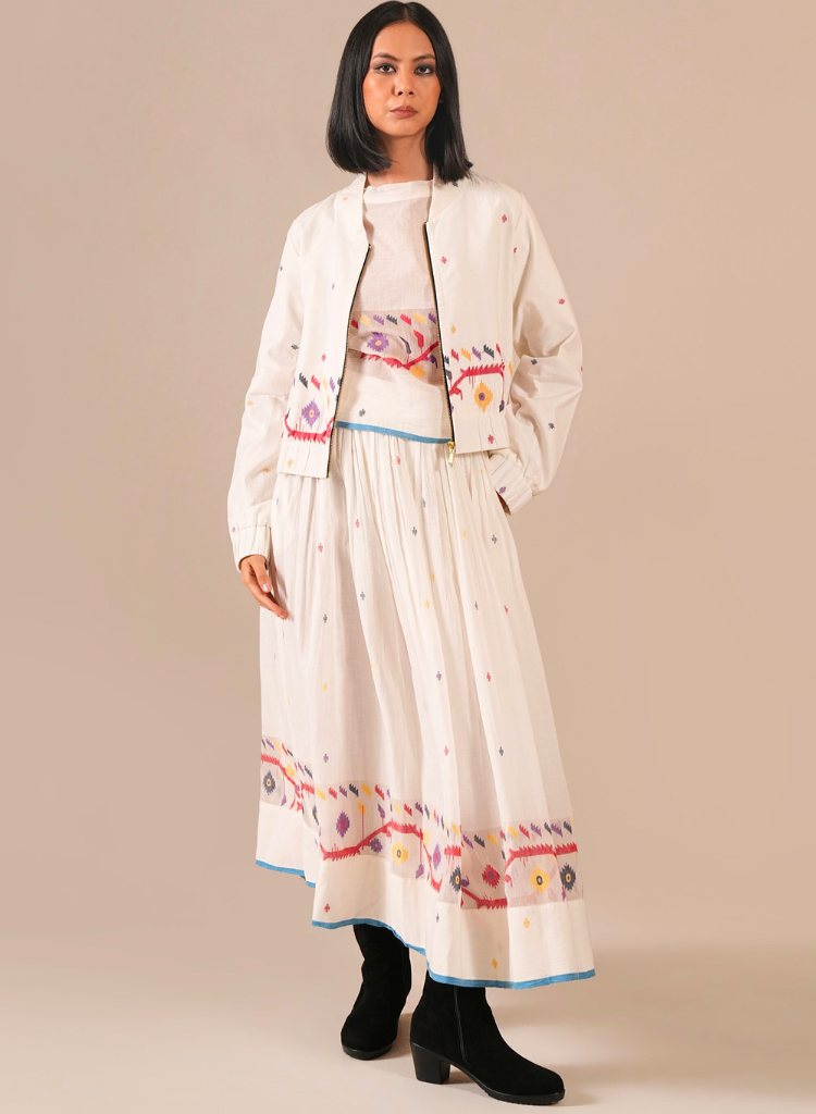 A three-piece set pairing a top, a skirt and a jacket. The boxy top features panel detailing. Length 20".The skirt features an elasticated waist. Length 37". Fully lined. The jacket features long sleeves and front zipper detail. Length 21".The model is 5'6" and is wearing a size S.