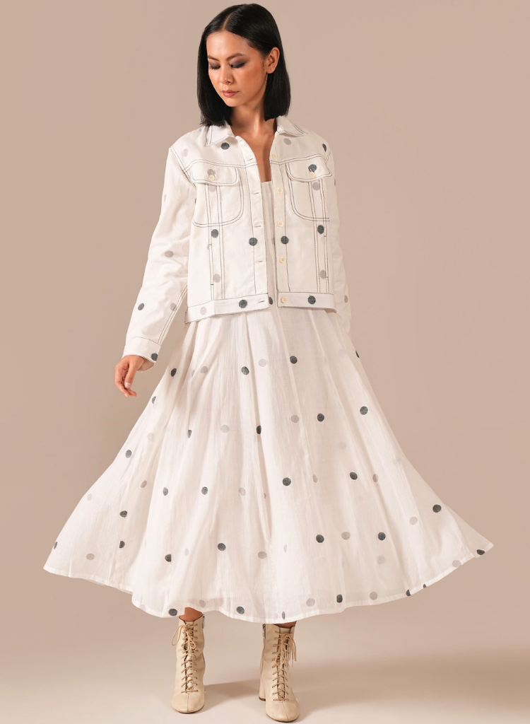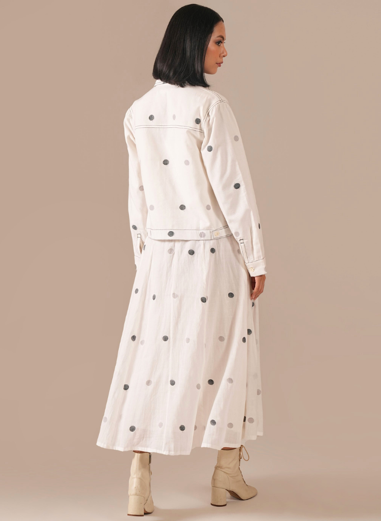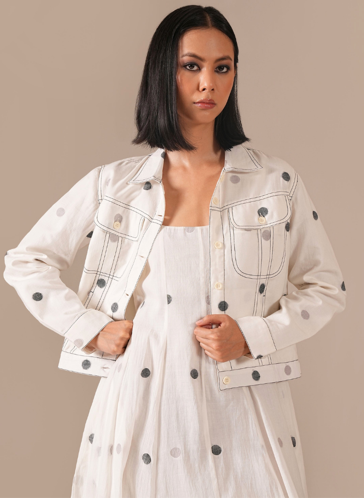 A two-piece set pairing the Pearl Spark Dress and a matching jacket. The fit-and-flare dress with panel detailing features a deep square neck, back zipper fastening, and functional side pockets. Length 50". Fully lined. The jacket features a collared neck and long sleeves. Length 20". The model is 5'6" and is wearing a size S.