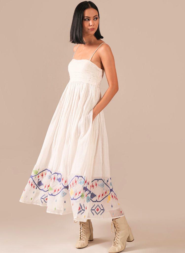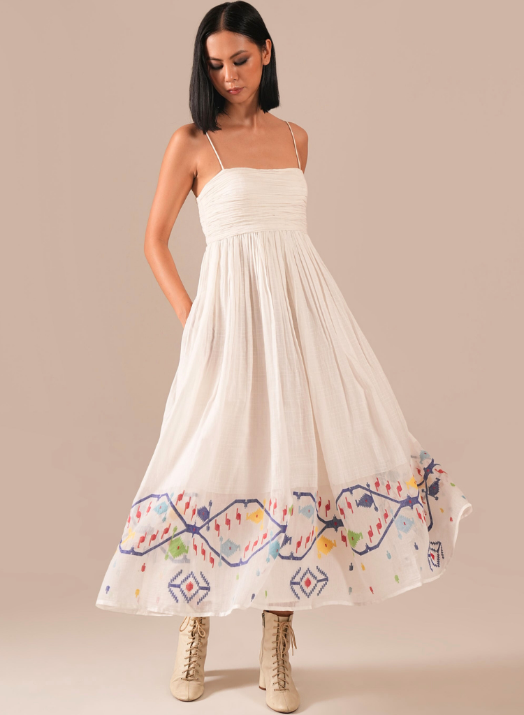A maxi dress with gentle gathers at the empire waistline featuring a ruched bodice, noodle straps, back zipper fastening and side pockets. Length 52". Fully lined. The model is 5'6" and is wearing a size S.