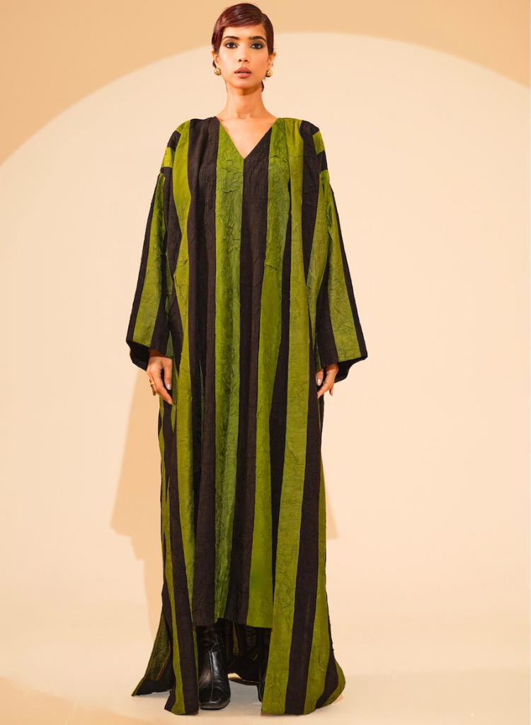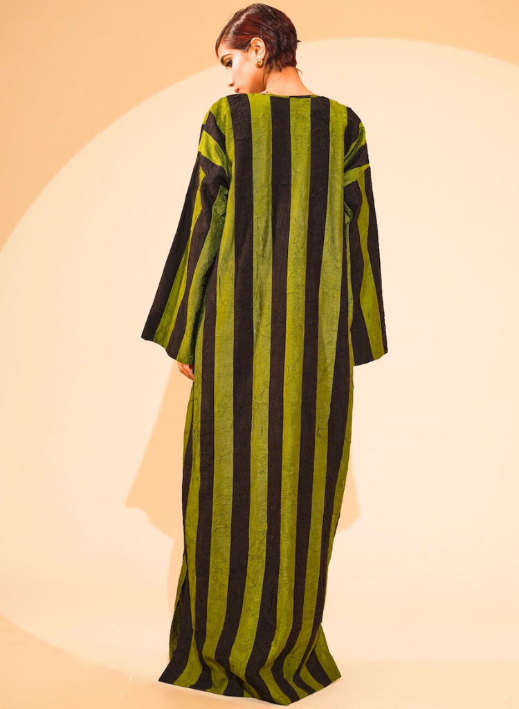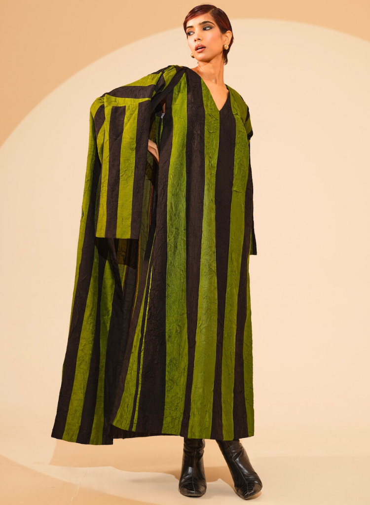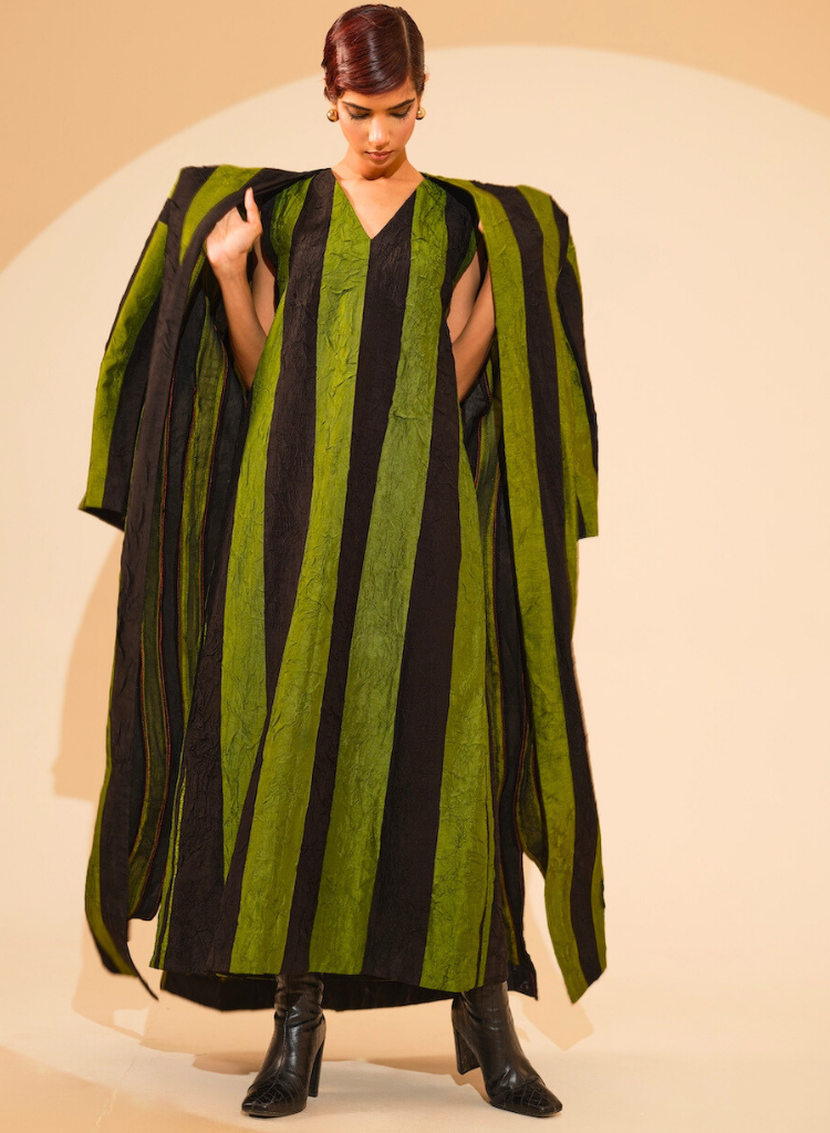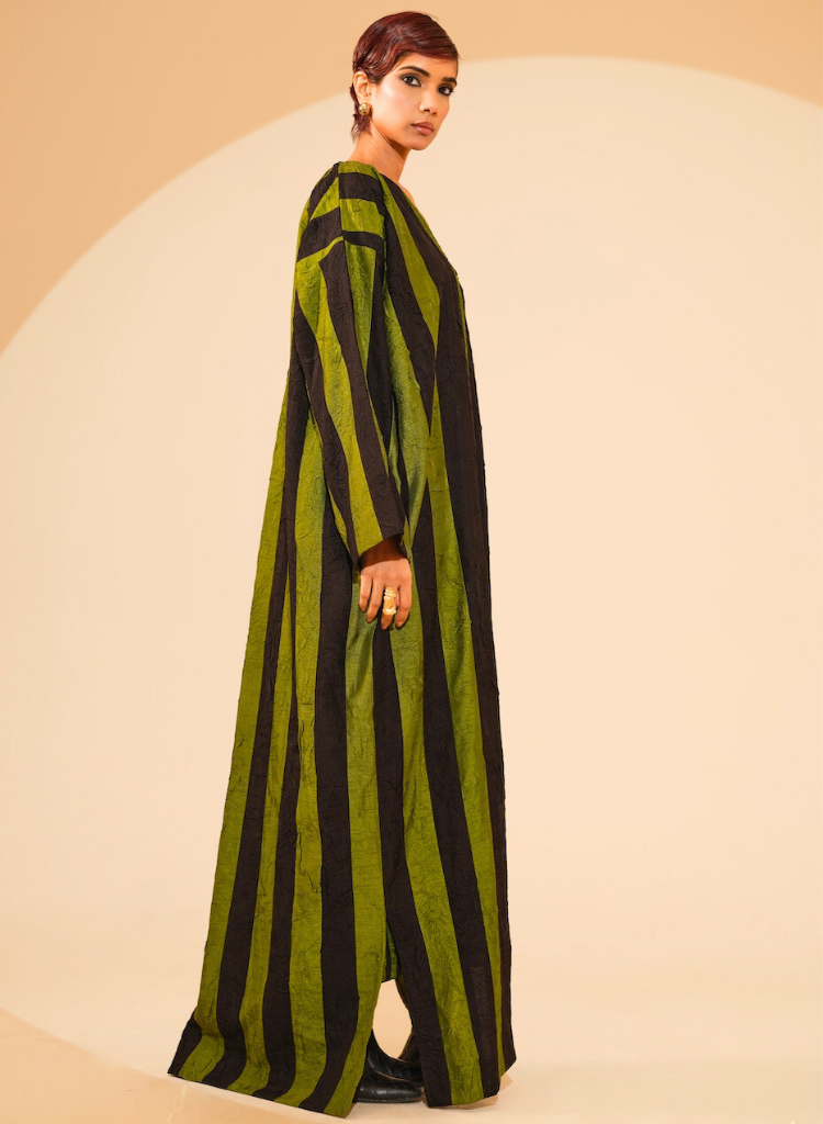 A two-piece set pairing the Twin Overlay and the Twin Dress. The kimono style overlay with hand sewn stripes patchwork features a clean, straight silhouette and a soft neckline. Length 60". The sleeveless maxi dress features a clean, straight silhouette and a soft V-neckline. Length 52".