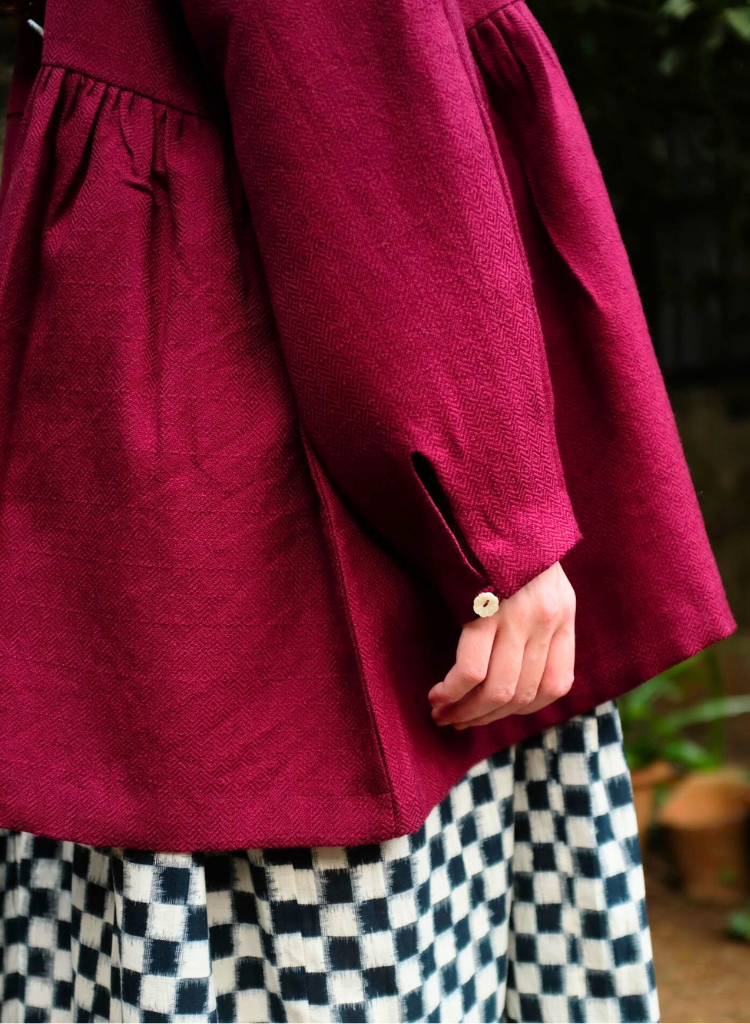 A coat featuring an open placket, clean round neckline, and sleeves finished with delicate loop fastenings and floral shell buttons. Length 30". The model is 5'6" and is wearing a size S-M.