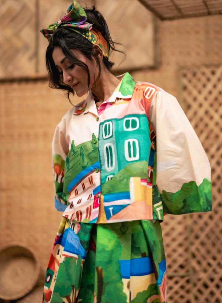 A two-piece set pairing the Bo Kaap Crop Shirt and the Bo Kaap Midi Skirt. The printed crop shirt with pleat details features a front button placket and dropped loose sleeves. Length 20". The matching box pleat midi skirt features a fitted waist and inseam pockets. Length 38". The model is 5'6" and is wearing size S.