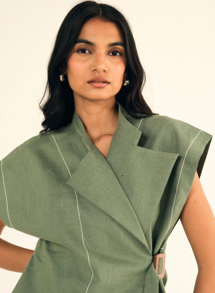 A wrap jacket featuring contrast white top stitch and a side buckle detail. Length 27.5". The model is 5'9" and is wearing size XS.