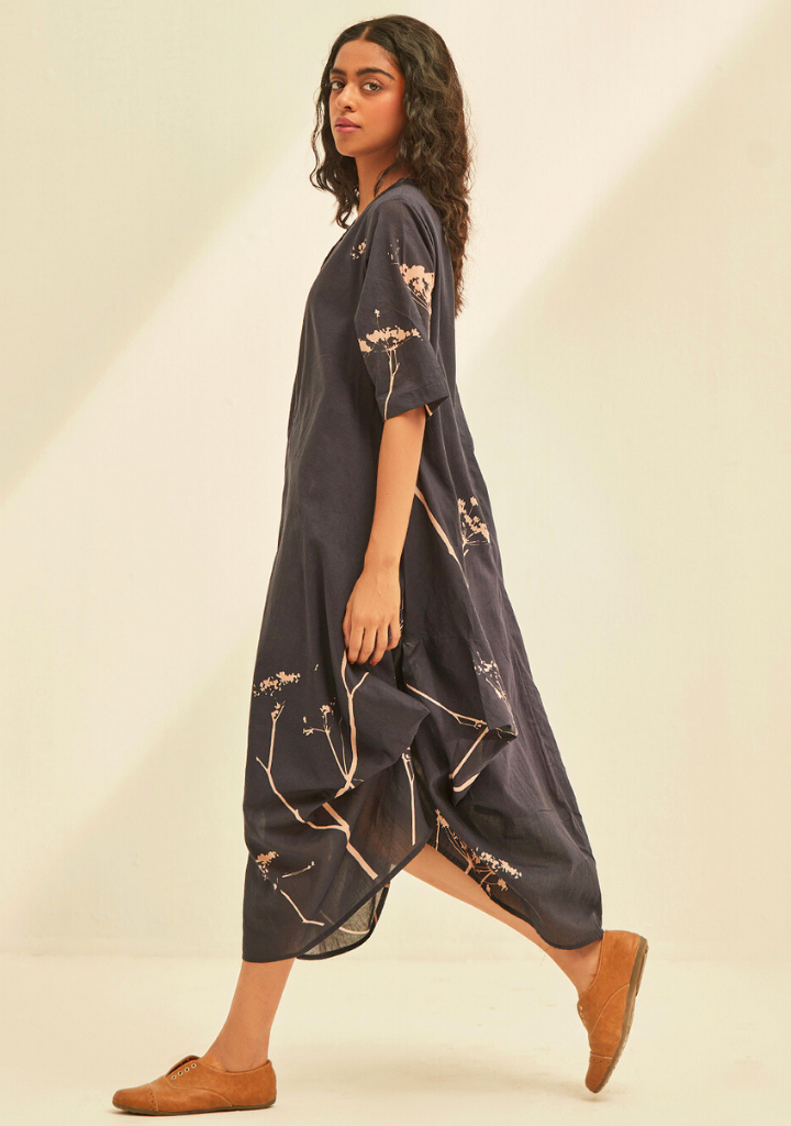 A printed dress with side cowls featuring a V-neck and inseam pockets. Length 49". The model is 5'7.5" and is wearing a size S.