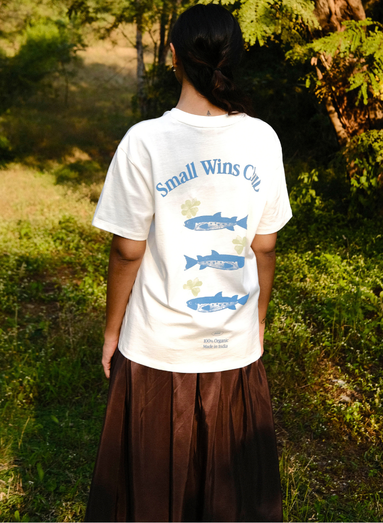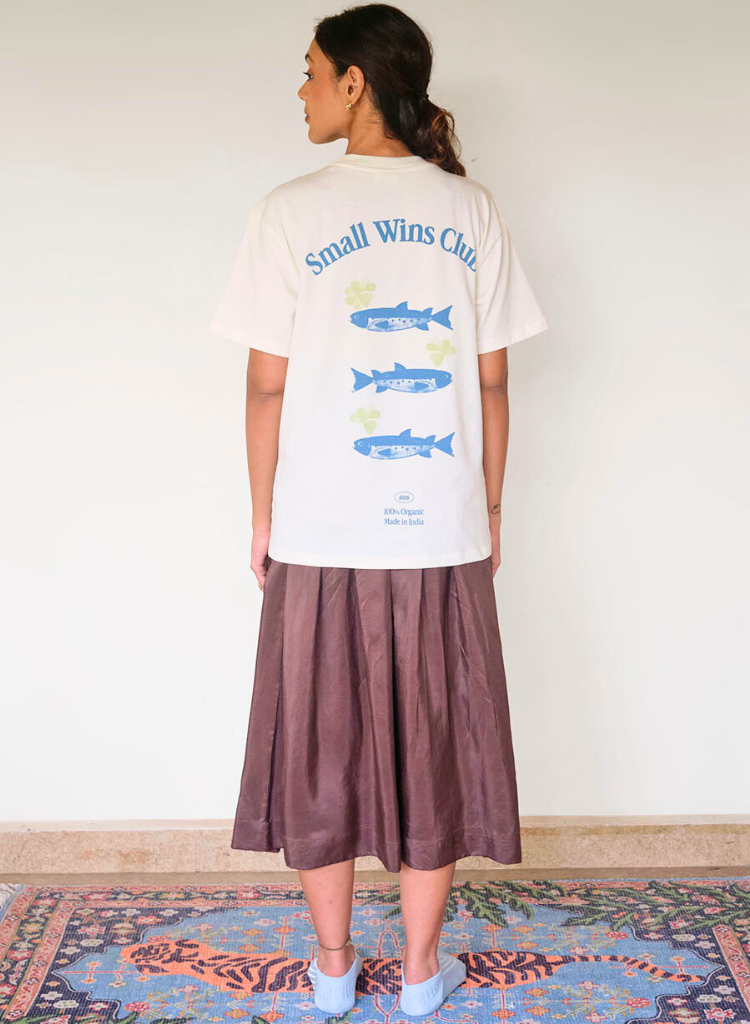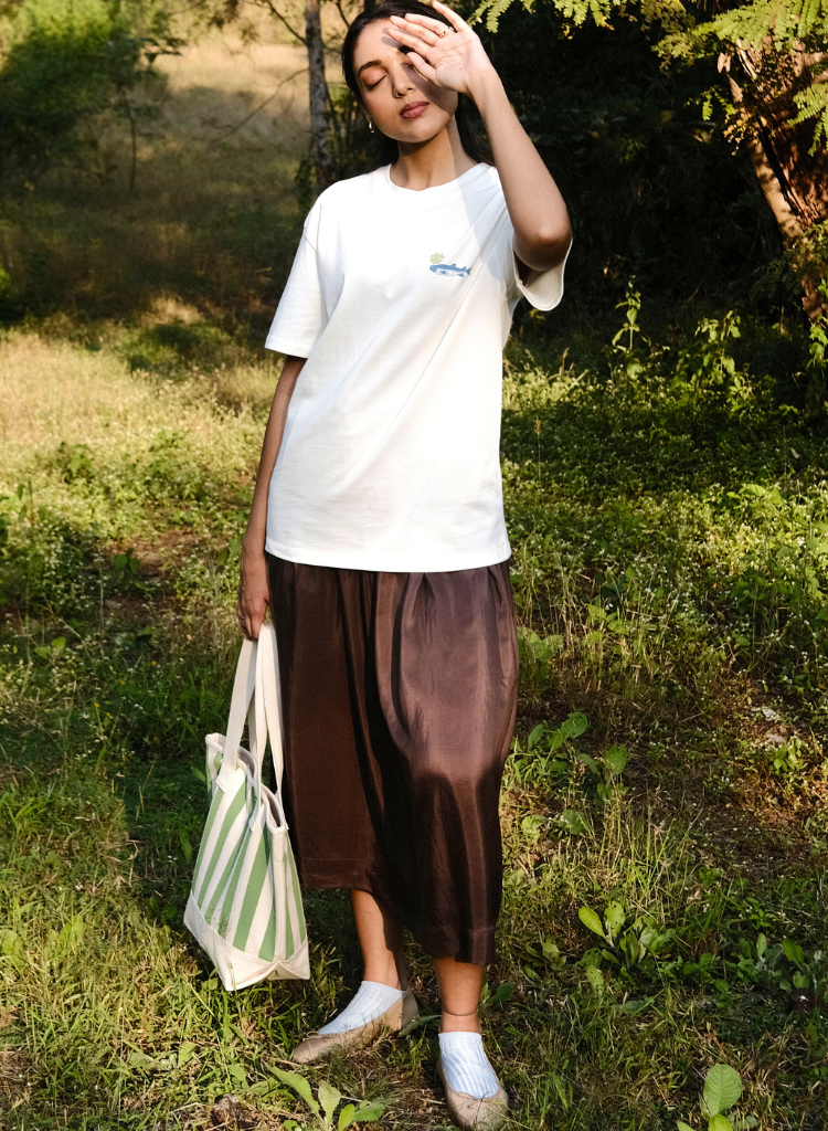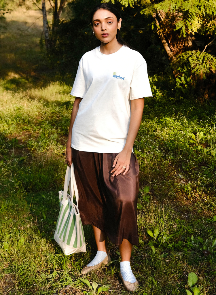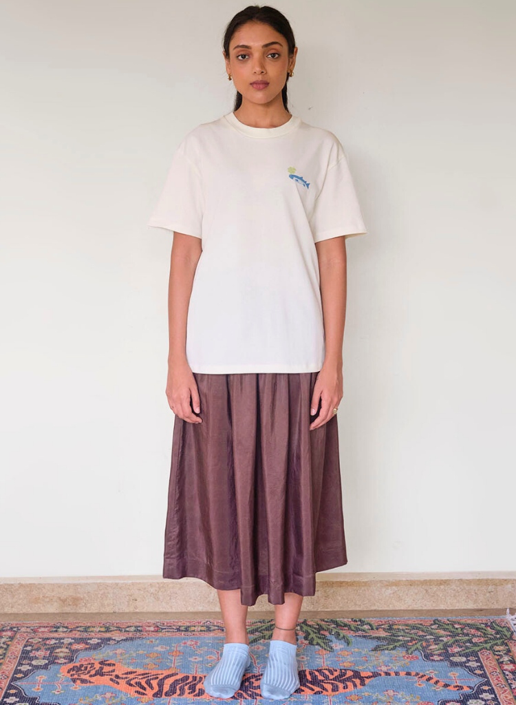 A relaxed fitting t-shirt featuring a round neck. The model is 5'8" and is wearing a size XS.