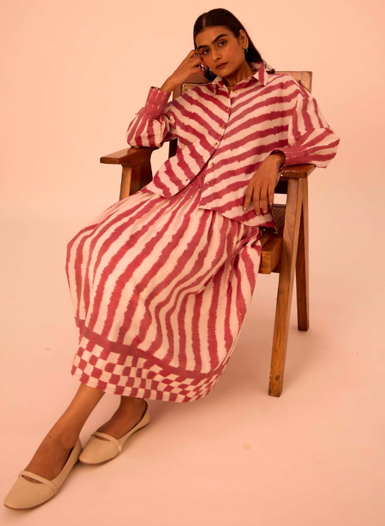 A two-piece set pairing the Henry Rhubarb Striped Shirt and the Levin Rhubarb Striped Skirt. The relaxed fitting shirt features a front placket with button fastening, drop shoulder bishop sleeves with pleated cuff. The pleated wrap skirt features a fitted waist and in-seam pockets. The model is 5'6" and is wearing size XS.