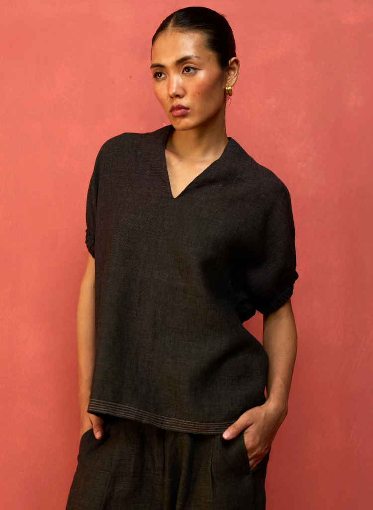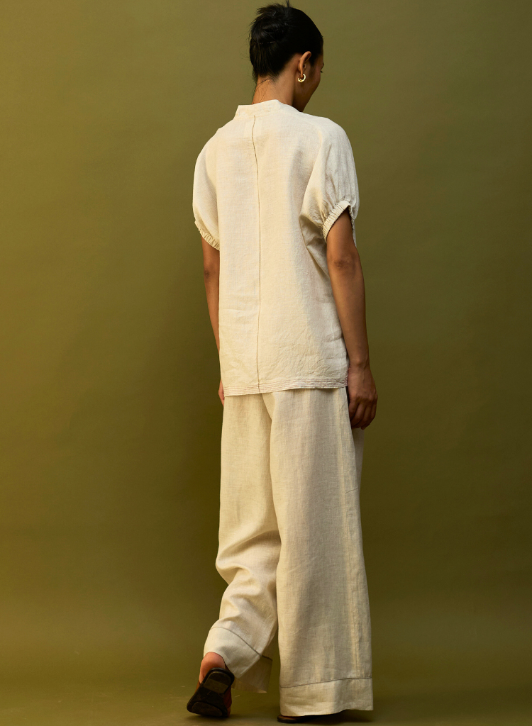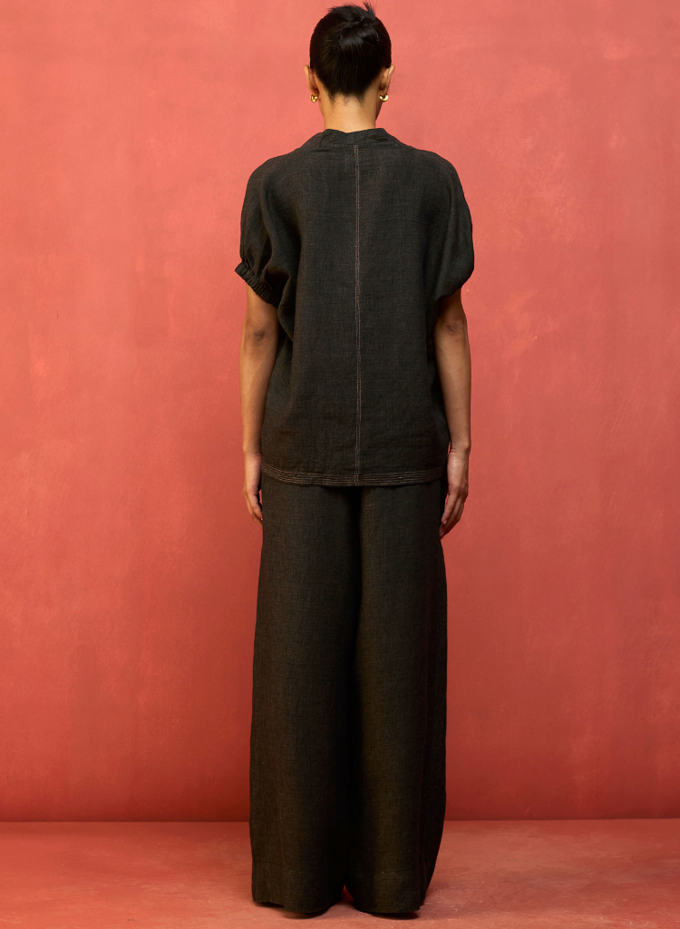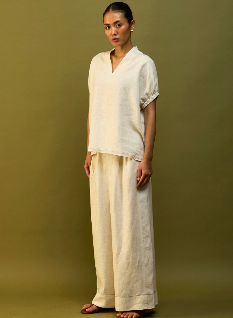 A two-piece set pairing the Hoshi Top and the Mekko Pleated Pants. The chic V-neck tunic features gently elasticated ruched sleeves and contrast top-stitching at the hemline. The relaxed silhouette is finished with contrast faggoting detailing at the back. The pleated wide - leg trousers with a high - rise are finished with a button closure and comfortable side pockets. The model is 5'" and is wearing a size XS.