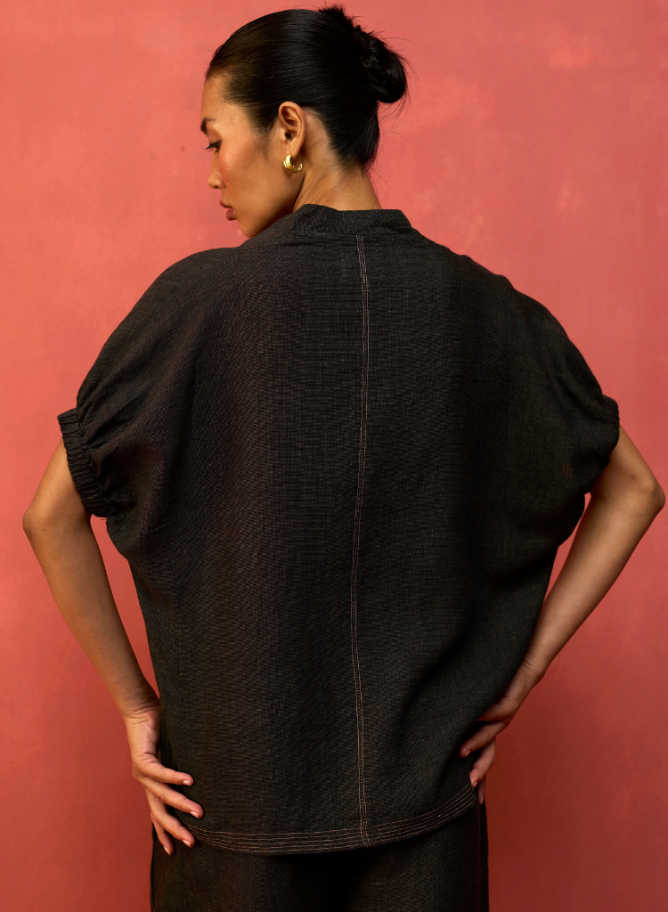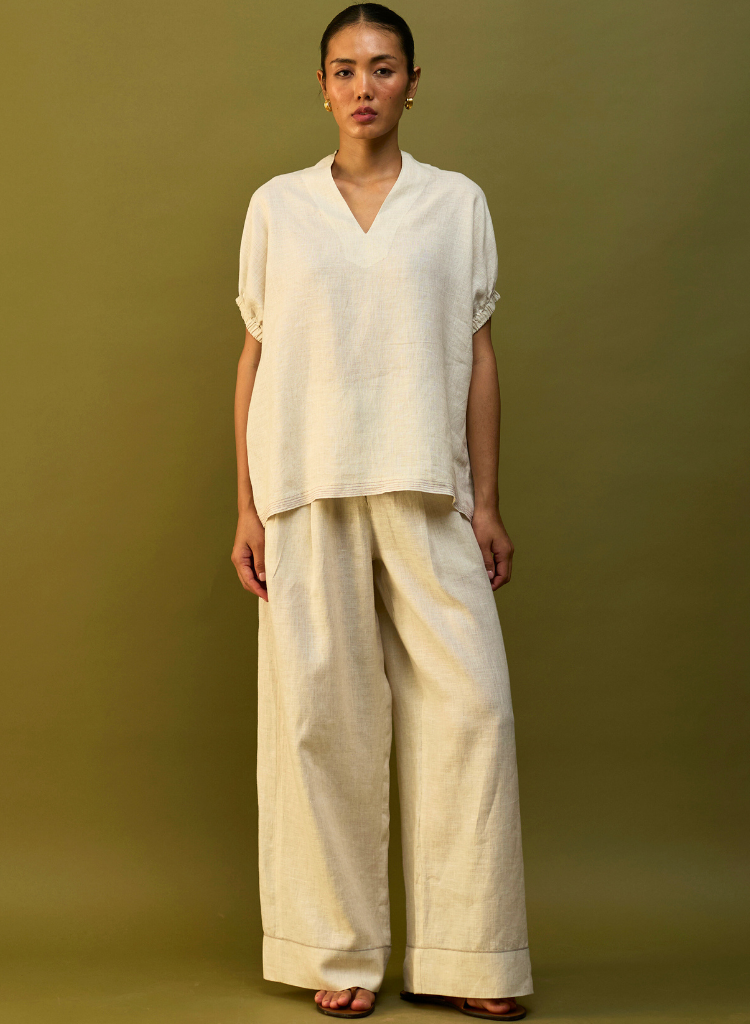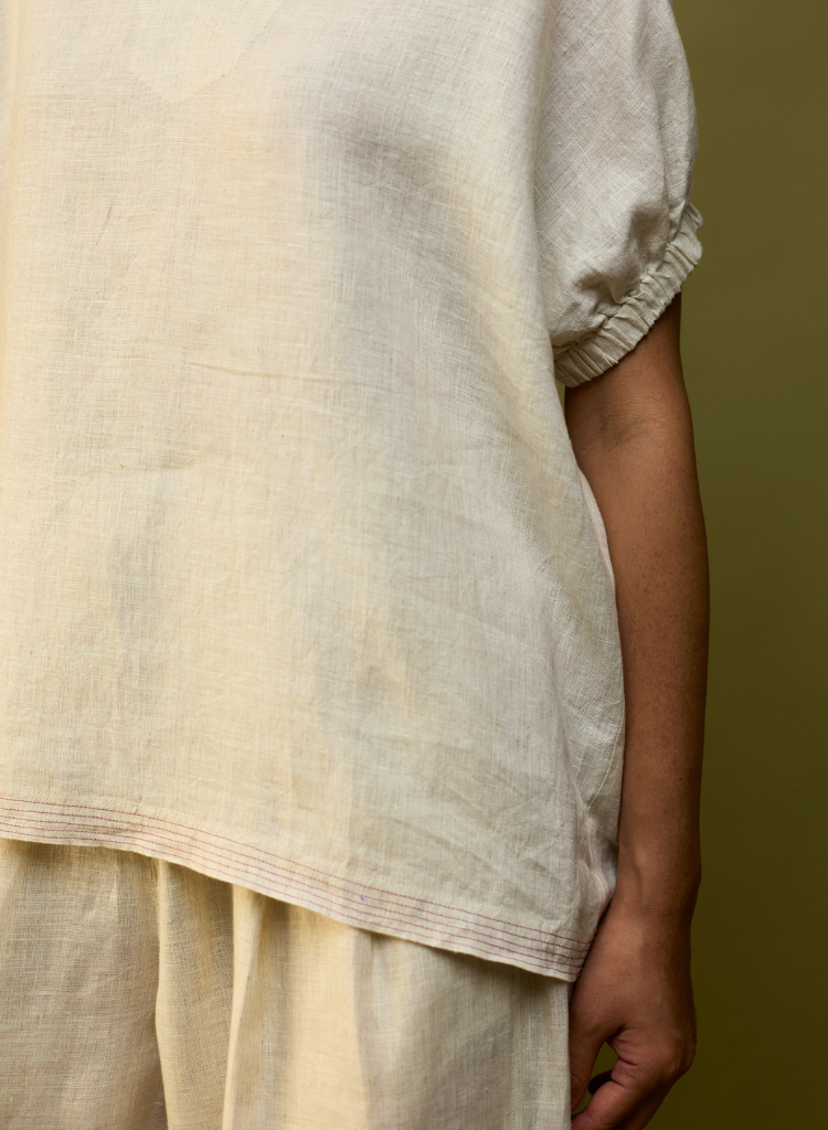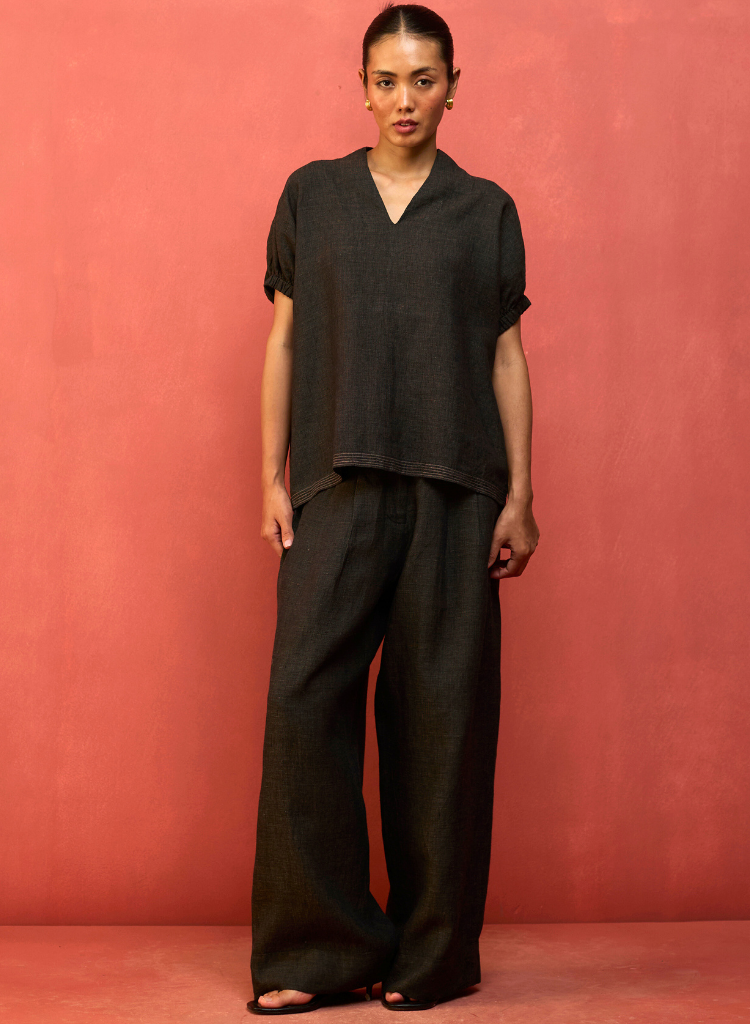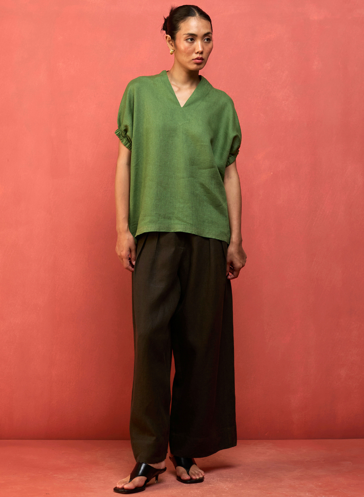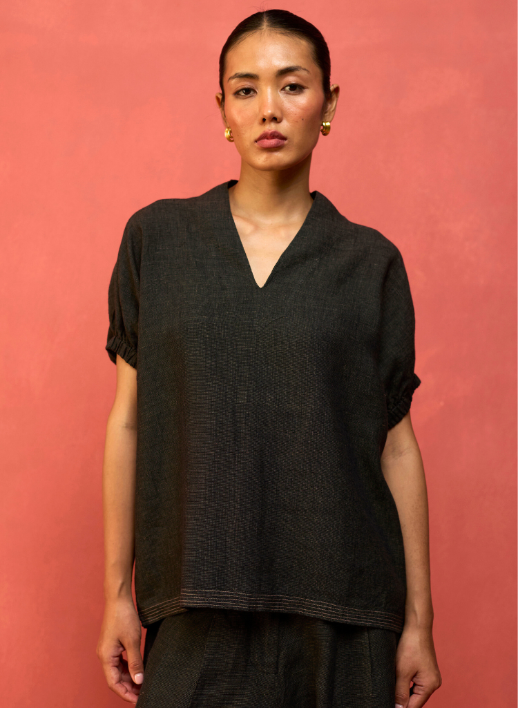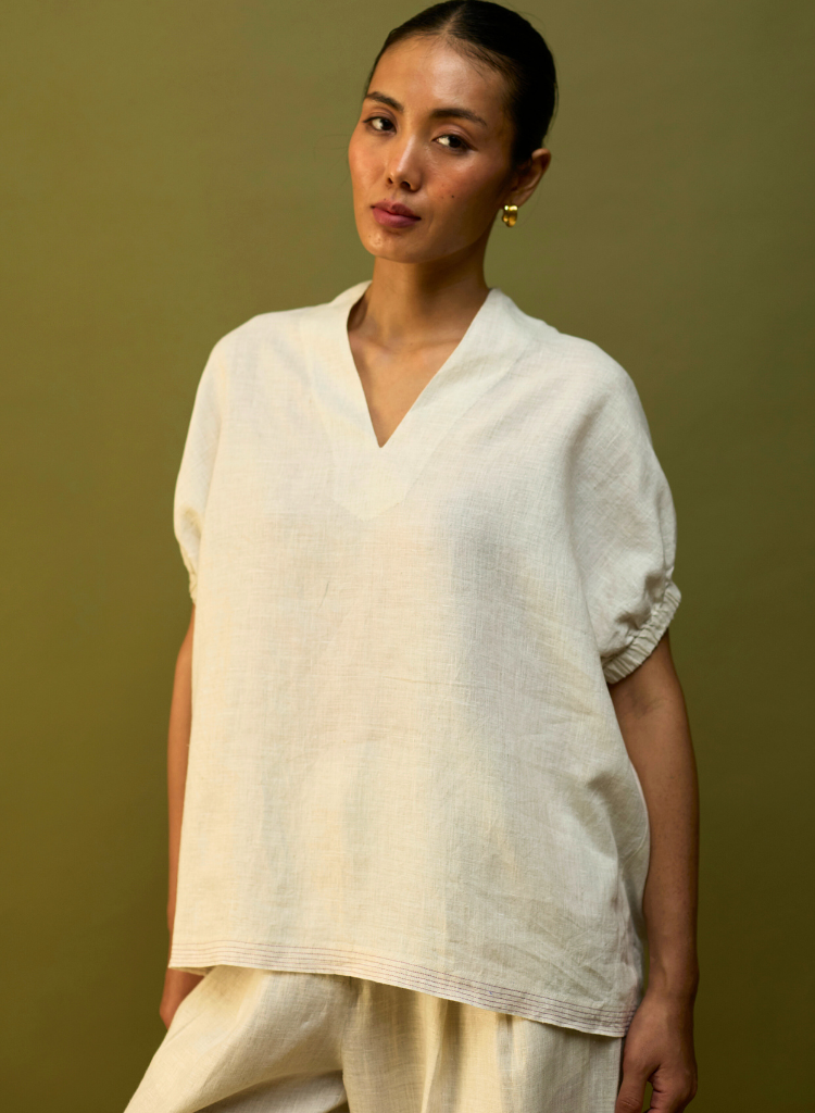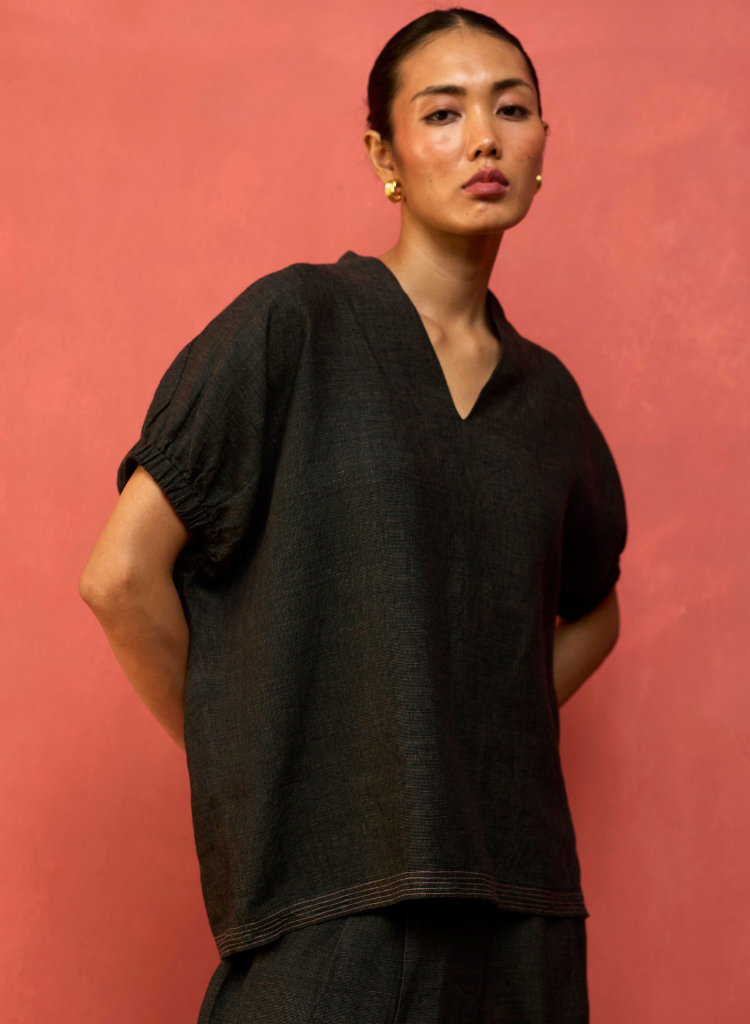 A chic V-neck tunic featuring gently elasticated ruched sleeves and contrast top-stitching at the hemline. The relaxed silhouette is finished with contrast faggoting detailing at the back. Pair with relaxed-fit trousers or tapered pants for a look that’s refined, yet free-spirited. The model is 5'8" and is wearing a size XS.