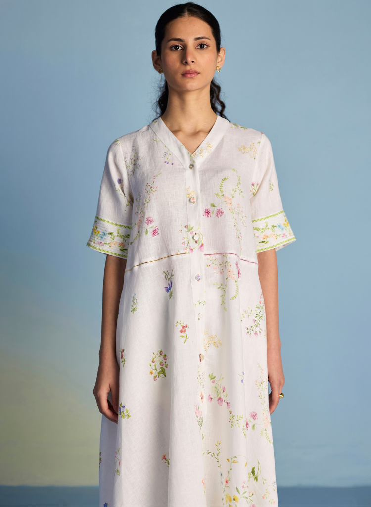 A button down shirt kurta featuring a V neck, an up-and-down curved hemline and hand fagotting stitch details on the front and back. Length 48". The model is 5'7" and is wearing a size S. Made in 100% linen. Comes with a slip.