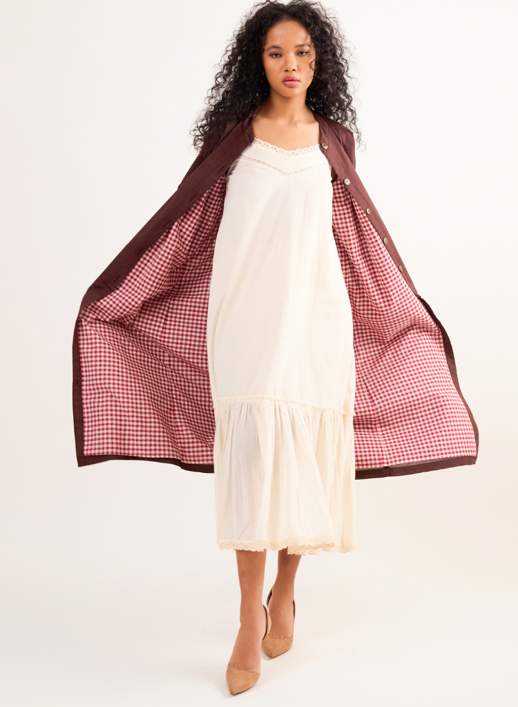 A calf length long sleeve jacket featuring a round neck, a front button placket and drop shoulders. Length 47". The model is 5'7" and is wearing size XS.
