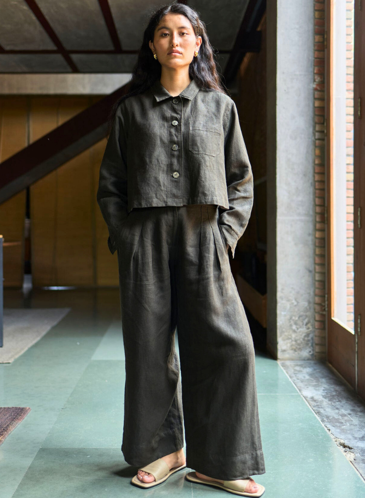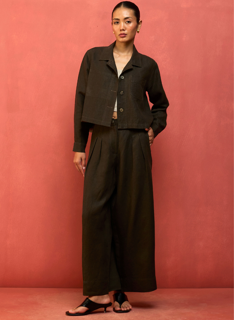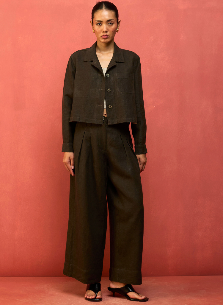 A two-piece set pairing the Nako Crop Jacket and the Mekko Pleated Trousers. This comfort-first crop jacket is crafted from yarn-dyed 200 gsm linen. Designed with statement oversized pockets and a hidden inner pocket, the Nako is detailed with intricate top-stitching throughout the bodice. Finished with bold mother-of-pearl buttons for an elevated touch. These pleated wide - leg trousers with a relaxed fit and subtle pleats, feature a fixed belt, button closure, and side pockets. The model is 5'8" and is wearing a size S.