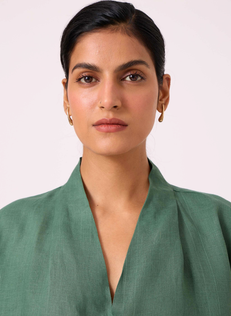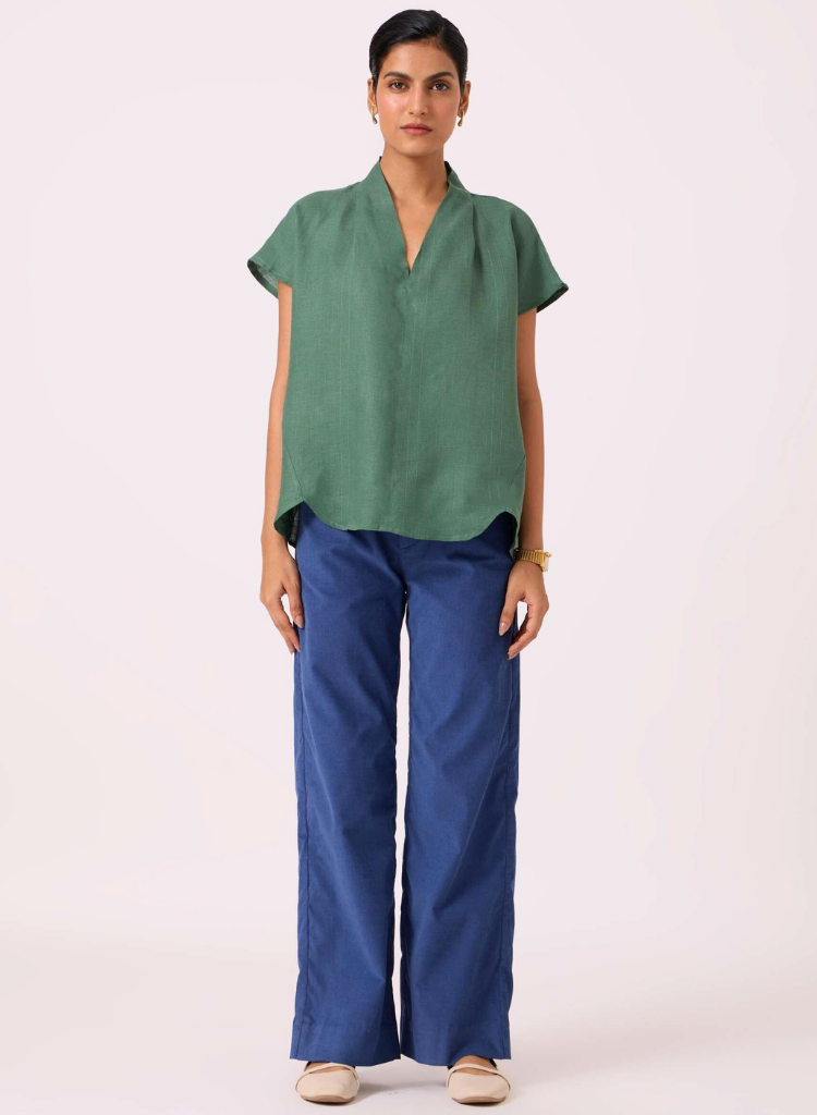 A V-neck top featuring a pleated collar and drop shoulder sleeves. The model is 5'6" and is wearing size XS.