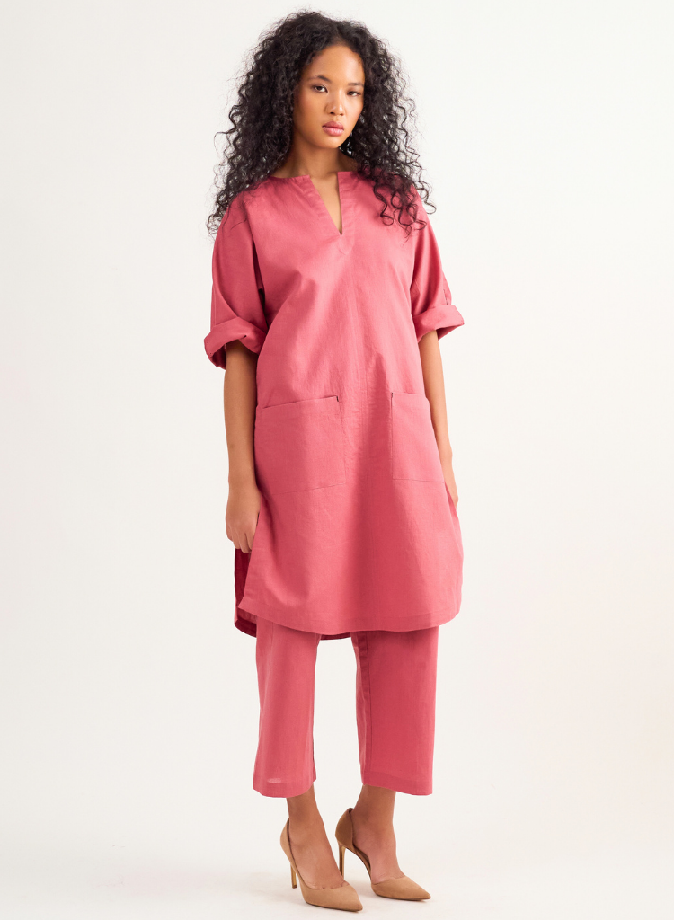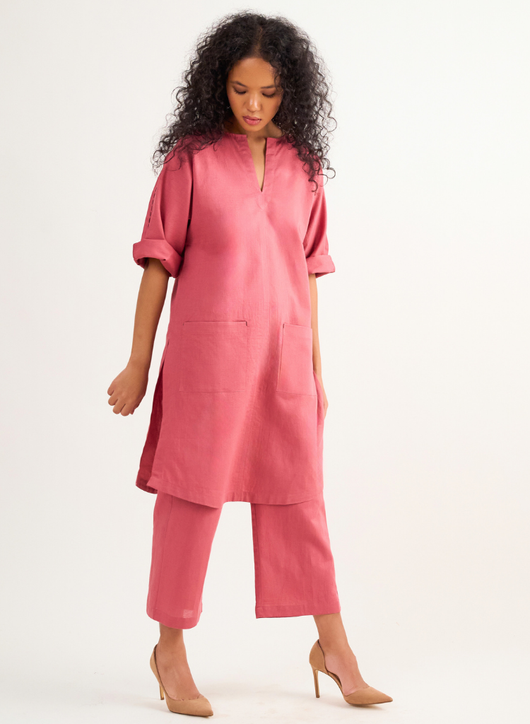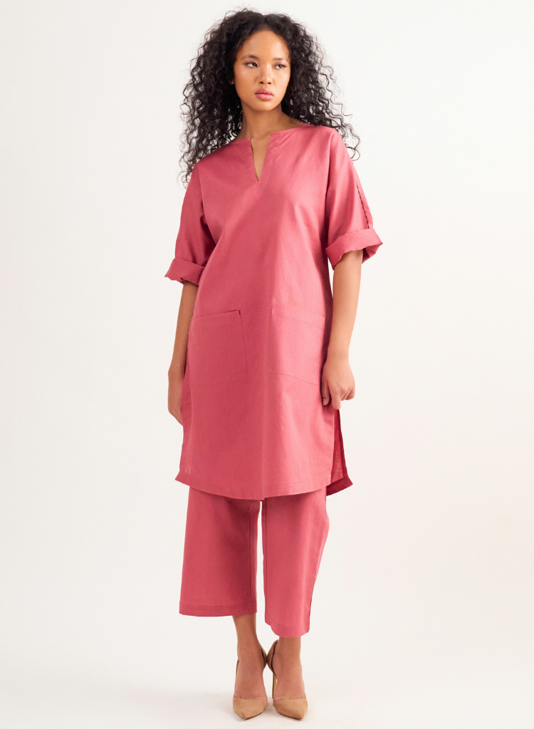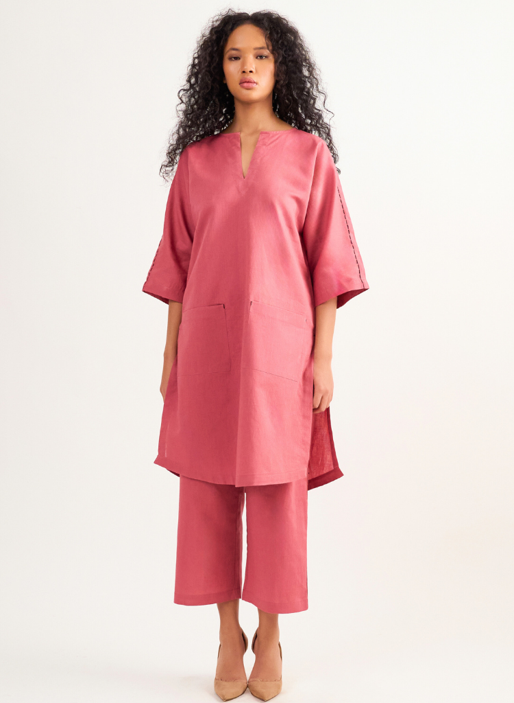 A two-piece set pairing a straight kurta and cropped pants. The straight-fitting kurta with patch pockets, running stitch detail and a round neck with a V-cut features relaxed fitting 3/4th sleeves and side slits. Length 38". The cropped pants feature an elasticated back waist belt. Length 35". The model is 5'6" and is wearing size XS.