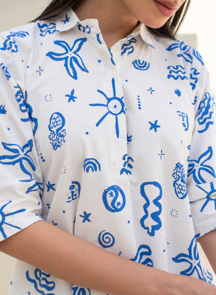 A two-piece set pairing a collared tunic and matching pants. The collared tunic features a concealed placket, 3/4th sleeves and side slits. The pants feature an elasticated waist and inseam pockets.  The model is 5'6 and is wearing size S.