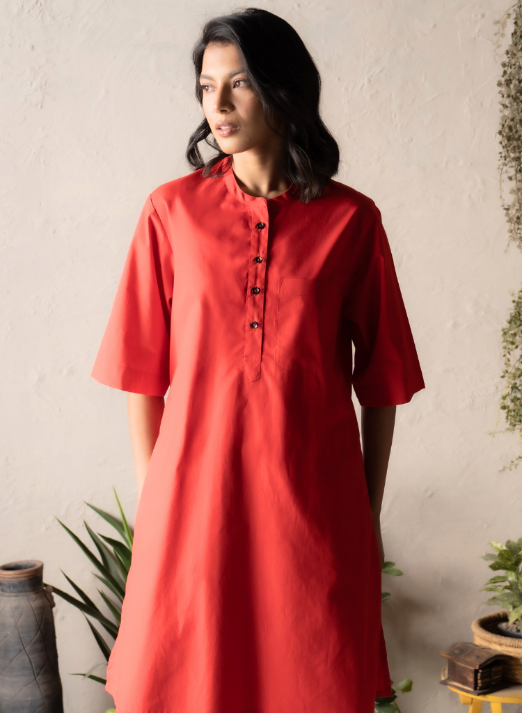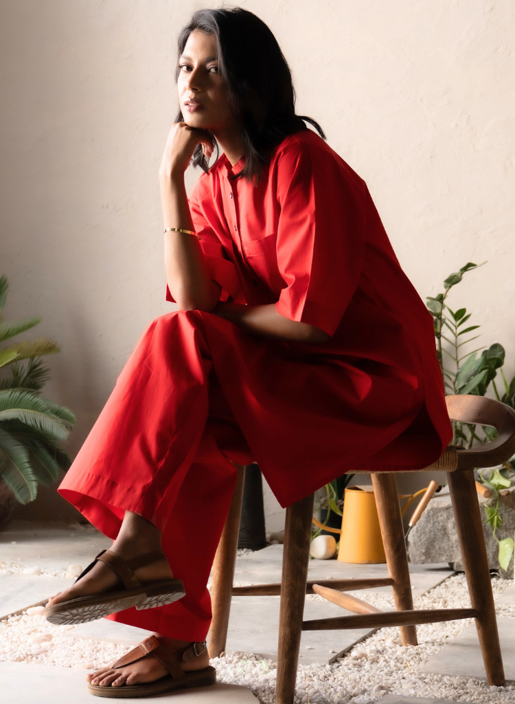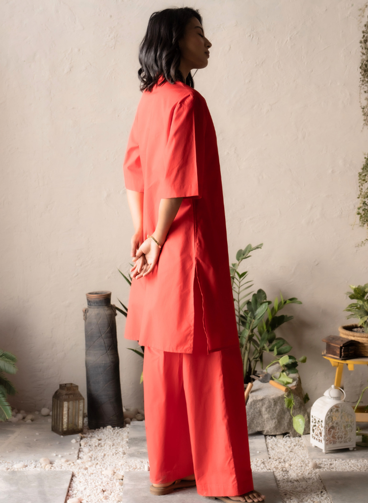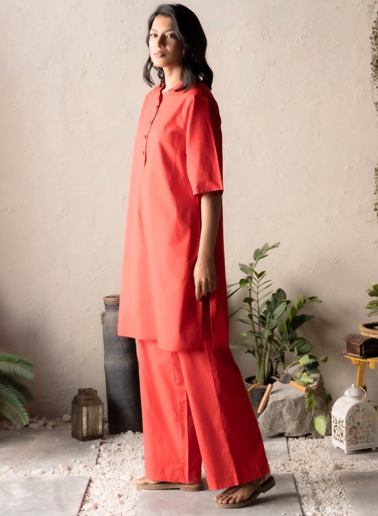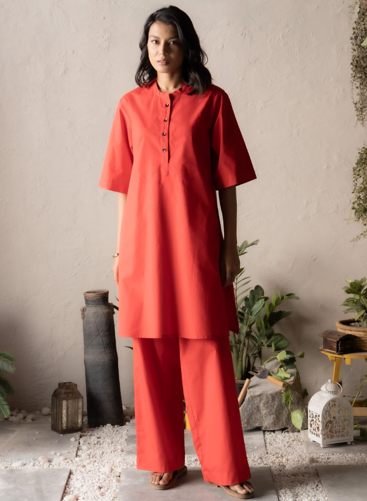 A two piece set pairing a oversized kurta and matching pants. The oversized kurta features a band collar and tonal buttons on the placket. Length 36". The matching loose pants feature an elasticated waist. Length 42". The model is 5'9" and is wearing size S.