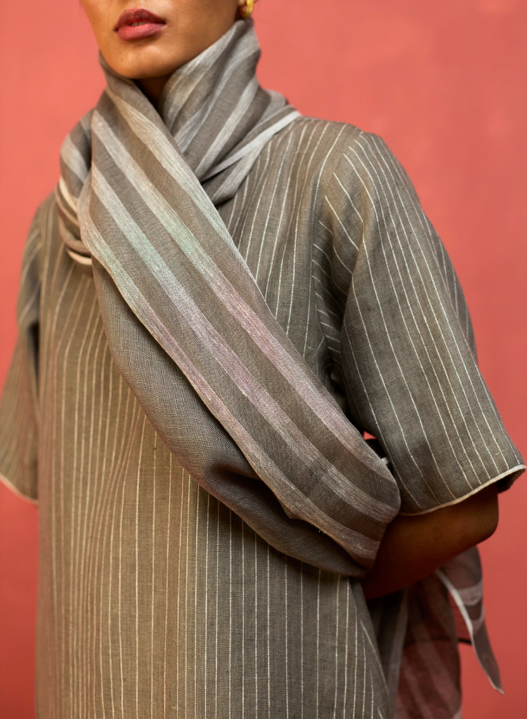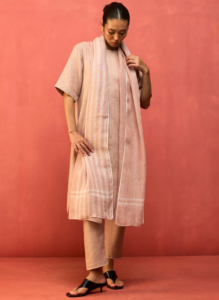 A three-piece set pairing the Semma Stripe Kurta, the Wera Tapered Pants and the Ruka Stripe Dupatta. The classic boat-neck kurta features intricate woven contrast selvedge piping along the neckline, sleeves and bodice hemline. The kurta is designed with elbow-length sleeves and lengthened side slits making it ideal for all-day comfort. The tapered pants are designed with a relaxed fit, side pockets, and an elasticated back waistband with a drawstring for a flexible, comfortable fit. Finished with a contrast - coloured woven selvedge at the bottom hem, adding a elevated touch to this timeless essential. This dupatta is woven with off-white stripes on one half and the borders, creating a striking contrast with the coloured linen. The model is 5'8" and is wearing a size S.