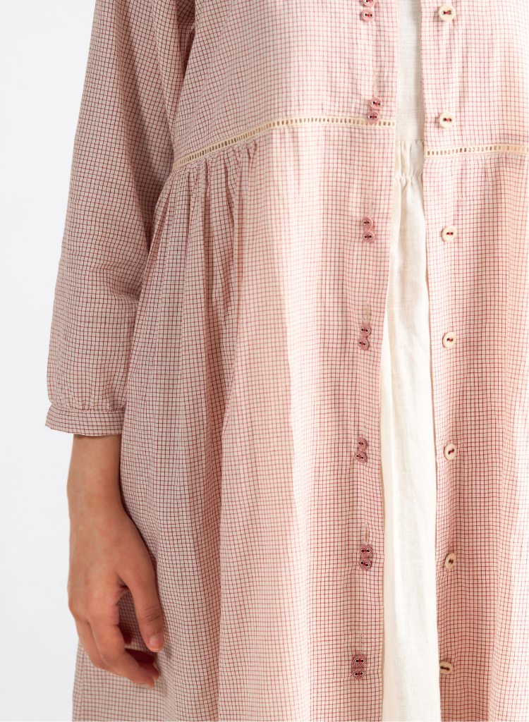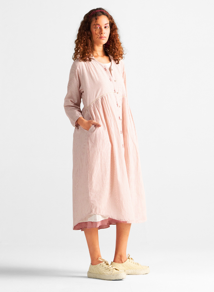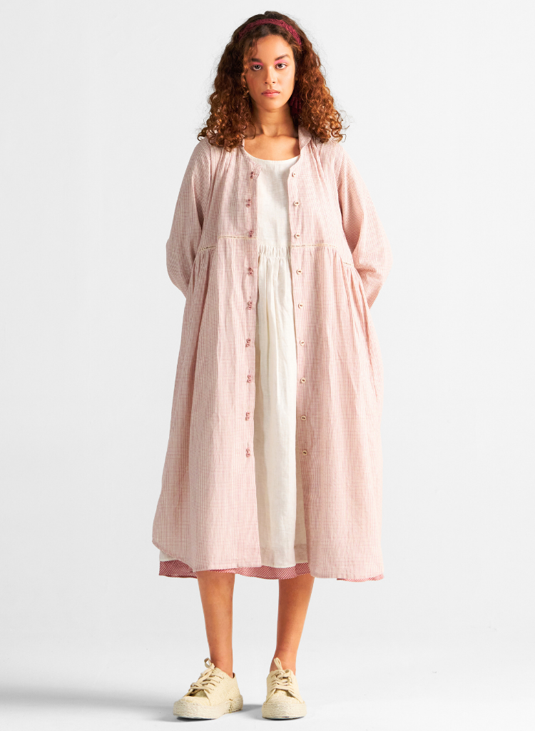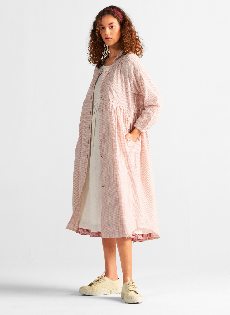 A relaxed fitting jacket with soft gathers and playful handwoven checks featuring a pleated neck, a front button placket and inseam pockets. Length 45". The model is 5'6" and is wearing a size S.